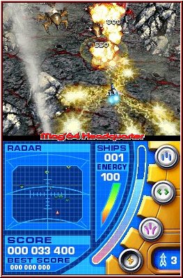 Eingeteilt sind die Waffen dabei z.b. in nach vorne gehende Laser, seitlich schießende Varianten und Suchgeschossen, die ihre Ziele auch finden wenn man sie nicht genau vor dem Schiff hat. Die sekundären Funktionen sind um einiges stärker, aber eben limitiert. Hier kommt der Touch Screen nun erneut zum Einsatz. Zunächst warten dort eine Scoreanzeige, ein Radar für das man aber selten Zeit hat, eine Lebensanzeige in Form einer Leiste und Zahlenanzeige, sowie die Anzahl eurer verfügbaren Leben und Smartbomben. Dazu exisitiert nun eine zweiten geschwungene und größere Energieleiste auf dem Touch Screen. Diese definiert nun die einsetzbare Energie für die sekundären Waffensysteme. Bei jedem Einsatz leert sich diese Leiste und man muß im Verlauf für Auffrischung sorgen. Dafür hinterlassen Gegner kleine Objekte die man aufsammeln sollte und somit immer Tinte auf dem Füller hat. Das Zusammenspiel der Funktionen ist gut gelöst und geht mit der Zeit auch schnell von der Hand. Man entwickelt schnell ein Vorliebe für bestimmte Waffen und paßt sein Spiel teilweise an diese an. Was man auch tun muß. Denn die Action die der Spieler auf dem Top Screen erlebt ist in gewisser Hinsicht einzigartig auf dem DS. Auch wenn ich dem Grafikteil nicht vorgreifen will zeigt Nanostray was auf dem DS an Effektpower in solch einem Spiel möglich ist. Das reicht von der Masse der Gegner, über deren Bewegungen bis hin zu Geschossen auf dem Screen, wo man sich manchmal fragt was eigentlich davon das eigene Schiff ist. ;-) Gegner tauchen unentwegt auf und hinterlassen bei der Zerstörung Punkte und sammelbare Objekte. Treffer werden mit dem typischen Blitzeffekt sichtbar, was später vor allem bei den Bossgegner natürlich hilfreich ist um die Trefferpunkte zu finden. Anfangs probiert man wie schon erwähnt alle Waffen mal aus, legt sich aber recht schnell auf 1-2 System fest die man fast ausschließlich nutzt. Dabei ist das Spiel schon schwer, aber keineswegs Unfair.