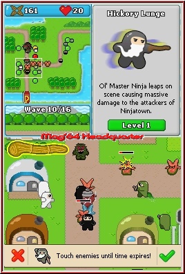 Soweit so gut, nun wollen wir mal schauen was spielerisch eigentlich drinsteckt in Ninjatown. Dazu wählt Ihr einen Bezirk an und eines der verfügbaren Level. Bevor ein Level beginnt werdet Ihr in einem kleinen Briefing über die Geschehnisse und Aktivitäten des Gegners informiert. In teils sehr lustig geführten Dialogen stellen sich euch die NPC’s im Spiel vor. Über allem steht dabei der Ninja Meister, der mit der Verteidigung von Ninjatown betraut worden ist. Dazu taucht oft der ängstliche Bürgermeister auf, der sich mehr verkriecht, als Verantwortung zu übernehmen. Seid Ihr informiert beginnt das eigentliche Level. Je nach Aufgabe gilt es die Level nach Zeit zu lösen, oder frei von Zeitzwängen einfach zu versuchen, so schnell wie möglich zu Gewinnen. Klar das sich dies auf das Rating auswirkt. Ganz wichtig für das gelungene Gameplay ist die Aufteilung der Screens. Hier folgt das Spiel festen Regeln, die sich im Verlauf auch nicht ändern. Die reine Spielaction mit all seiner spaßigen Hektik spielt sich auf dem Touch Screen ab, während der Top Screen Informationen beherbergt, sowie eine kompakte Gesamtkarte, samt dem als Beobachter herumschwebenden Ninja Meister. Ninjatown ist unter der knuffigen Oberfläche ein wie schon erwähnt sehr gelungener Echtzeit Strategie Titel. Bei einem Blick auf die Gesamtkarte kann man das grobe Spielprinzip wunderbar erklären. Im Endeffekt geht es darum die als Wellen einfallenden Gegner Horden daran zu hindern, die festen Wege der Karte zu passieren um am Ende die eigene Fahne zu attackieren. Ihr als Spieler müsst sie also am Durchkommen hindern und Vernichten. Dabei folgt das Spiel eher dem Verteidigungsansatz und damit eben der durchaus großen Vorliebe der deutschen Spieler. Ihr greift in dem Sinne nicht selber an, sondern reagiert größtenteils auf die Aktionen des Gegners. Schauen wir uns zunächst das ganze mal anhand einer einfachen Karte an. Denn auch diese sorgen im Verlauf zunehmend für Kopfzerbrechen beim Spieler.