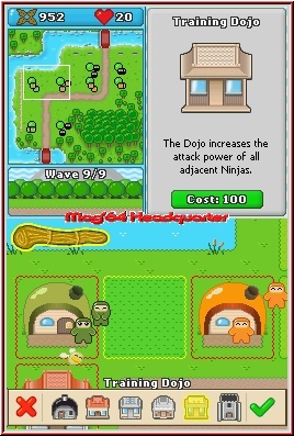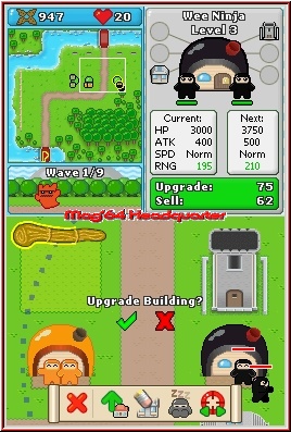 Auf einer einfachen Karte gibt es so z.b. nur eine Straße, die vom Startpunkt am Ende bis zur eigenen Fahne führt. Vom Startpunkt aus kommen in regelmäßigen Zeitabständen die Gegnerwellen. Im Top Screen unter der Karte sieht man die Abfolge der Wellen, wie viel davon im Level erscheinen und welche Gegner bei jeder Welle dabei sind. Die eigene Fahne wiederum besitzt wenn man so will 10 Lebenspunkte, die ebenfalls im Top Screen angezeigt werden. Würde man eine Welle aus 10 Gegnern einfach durchlaufen lassen, hätte man verloren und müsste das Level von vorn beginnen. Also gilt es die Gegner auf dem Weg zur Fahne irgendwie aufzuhalten und natürlich zu vernichten. Für dieses Ziel bietet Ninjatown nun die Möglichkeiten Einheiten und Gebäude zu erreichten, die dies bewerkstelligen sollen. Wie gesagt eigentlich nichts anderes wie in Strategie Spielen, die das Ganze mit Panzern oder Geschützen umsetzen. Nichts anderes ist Ninjatown eigentlich. Nur eben alles speziell angepasst. Links und rechts der Wege, von denen später ja mehr als nur einer vorhanden ist, hat man die Möglichkeit auf vorgefertigten Plätzen Gebäude zu errichten. Das können Einheiten Gebäude sein, oder eben unterstützende Gebäude, welche sich auf die Kampfeigenschaften der Einheiten auswirken. Einfachste Einheiten Variante sind die Wee-Ninjas. Diese stellen den größten Bevölkerungsanteil und sind im übertragene Sinne die Infanterie des Spiels. Platziert man über eine Menu samt Pen Benutzung ein Gebäude der Wee-Ninja, so erscheinen nach dem nur wenige Sekunden andauernden Bau 2 Wee-Ninjas. Die kleinen schwarzen Racker haben nun diverse Eigenschaften, die später für alle Einheiten verfügbar sind. Das beginnt bei der Lebensenergie, einem Angriffswert, dem Tempo Gegenstück und die Reichweite, in der sie agieren können. Ist alles fertig decken sie nun einen Teil der Strasse ab und laufen automatisch auf den Gegner los, wenn diese sich in der Reichweite der Ninjas befinden. Treffen die Kontrahenten aufeinander, so prügeln sie einfach gesagt aufeinander ein. Sowohl eure Einheiten, wie auch die Gegner besitzen über dem Kopf sichtbare Lebensleisten, die sich je nach Kampfgeschehen leeren.