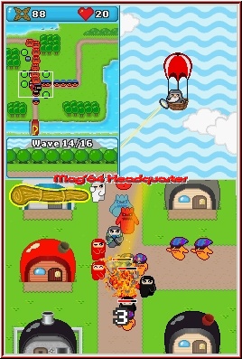 Der unter dem Dach der US Firma Southpeak Games entstandene Titel, wird dabei hierzulande über die Flashpoint AG vertrieben. Dabei kann das Spiel nicht nur spielerisch stark punkten, auch bei den Rahmenbedingungen stimmt in diesem Game eigentlich alles. Das beginnt bei der kompletten Lokalisierung, einem bequemen Autosave auf der internen Batterie und reicht bis zum enthaltenen Multiplayer und der äußerst konsequenten Nutzung der DS Feature. Nach der Testsession kann man wirklich sagen das Ninjatown mit seinem Gameplay wie gemacht ist für den DS. Egal ob Touch Screen oder Mikro, vieles ist hier richtig gut umgesetzt und in die Möglichkeiten eingebettet. Dabei ist übrigens die grafische Umsetzung nicht speziell für das Game gemacht, sondern stammt vom gleichen Designer, der mit den Shawnimals bekannt geworden ist. Knuffige Charaktere in Form der Ninjas, die dem Spiel auch das gewisse Flair und einen eigenen Charme verleihen. Auch die Story mutet zunächst eher an, wie für ein Kinderspiel gemacht. Wie der Titel schon sagt dreht sich im Spiel alles um die Location Ninjatown. Nach einer mysteriösen Eruption des nahe gelegenen Vulkans Feroshi, wird der friedliche Ort Ninjatown plötzlich von dem bösen Mr. Demon und seiner Armee der Wee Devils, einer Horde zerstörerischer Teufel, attackiert. Er verfolgt den teuflischen Plan, die weltbekannten, deliziösen Ninjasternkekse mit seinem teuflischen Dunkelsirup zu infizieren und so den Export-Markt und damit die Ökonomie der Ninjas zu zerstören. Was ein wenig schräg klingt, zeigt später im Spiel das man auf so einer Story aufbauend ein mehr als interessantes Spielprinzip umsetzen kann. Denn Ihr als Spieler übernehmt einfach gesagt die Verteidigung von Ninjatown und dürft dies im Stile vieler Echtzeitstragie Titel, auf eine etwas andere Art tun.