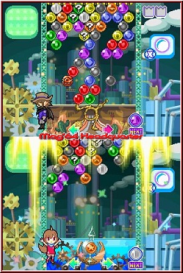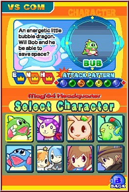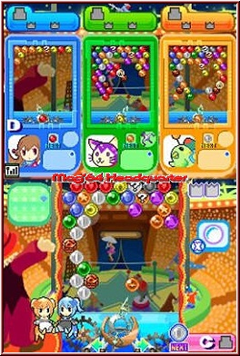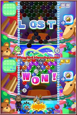 Grundprinzip ist es durch Kombinationen von Blasen gleicher Farbe oder Wertigkeit, die aneinander haften den Action Bereich zu leeren. Im Gegensatz zu anderen Modi, wo oben immer wieder auch neue Reihen mit Blasen auftauchen, sitzt euch hier die Zeit im Nacken. Nach einer bestimmten Zeit wird die aktuelle Blase automatisch abgeschossen. Egal, wohin ihr zielt. Auch so kann man sich den Screen zubauen, was aber gefährlich ist. Erreicht diese unten eure Linie, dürft Ihr noch mal anfangen. Neben einfachen und farbigen Standard Blasen gibt es sogenannte Bonus und Spezialblasen, die bei richtiger Kombination durch die geschossenen, mehr Punkte bringen und den Screen auch in einer Kettenreaktion leeren können. Schießt man z.b. von unten eine grüne Blase an 2 nebeneinander liegende grüne im Actionfeld, ist ein Miniziel erreicht und diese Blasen verschwinden aus dem Actionfeld. Wie immer ein großer Vorteil, das Blasen verschiedener Farben, die an Paaren hängen mit abfallen, wenn man dem Paar eine weitere Blase dieser Farbe zuschießt. So muss vor allem sehr viel kombiniert werden um zum einen den Screen nicht zu voll zu bauen, aber so das man immer gleich mehrere Reihen wegbröseln kann. Dabei ist das Spiel physikalisch wie immer sehr korrekt und bietet natürlich auch wieder das Banden Feature. Benutzt Ihr die Bande, so prallt die Blase so ab wie sie sollte. Damit sind auch Bereiche möglich, die man auf direktem Wege durch nach oben Schießen nicht erreicht. Baut Ihr euch aber zu, kommen euch eure Gebilde von oben immer näher. Bei den Boss Gegnern ist das sogar meist die einzige Möglichkeit. Der Boss baut euch schön zu und schickt euch immer neue Blasensammlungen entgegen, während Ihr ihn oder drum herum fliegende Objekte im Top Screen treffen müsst. Meist geht es sogar nur mit der Bande. Dabei ist der Schwierigkeitsgrad wieder gut getroffen. Entnervt den DS aus der Hand legen wird man nicht, aber ein simpler Abendfüller sieht auch anders aus. Auch logisch das im Verlauf des Spiels die Anordnungen immer kniffliger werden und bei weitem nicht immer mindestens 2 gleiche Blasen nebeneinander angeordnet sind.