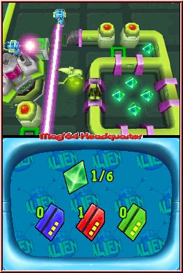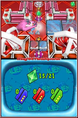 Die Einteilung der Spielwelten im Titel ist äußerst simpel aufgebaut, da sich eine Stage auf der Weltkarte an die nächste reiht. Um eine Welt erfolgreich abzuschließen und sich an den Kampf gegen den Endgegner heranzuwagen, muss eine gewisse Anzahl an Levels erfolgreich abgeschlossen werden. Je mehr Levels Ihr löst, desto mehr Galeriebildchen (Artworks) schaltet Ihr frei, ebenso komplettiert Ihr hiermit die Prozentanzeige des Spielstandes. Jedes Spielfeld besitzt eine übersichtliche Größe und kann auf Wunsch per Tastendruck mit einer Überwachungskamera "abgefahren" werden. Das Ziel der Aliens ist es, alle Kristalle eines Levels deren Eigen zu nennen, um den Warp zum nächsten Abschnitt frei zu schalten. Diverse patrouillierende Drohnen erschweren die Ausflüge in die poppig-bunten Fantasiewelten im penibel angeordneten Rechteckschema. Nur selten weicht eine Stage in ihrem Grundaufbau von den vorhergehenden ab, hier hätte man für etwas mehr Abwechslung sorgen dürfen. Lobend zu erwähnen sind die vielen bereits oben erwähnten Abhängigkeiten, die das Spiel zu seinem Vorteil ausbaut. Immer wieder müsst Ihr über ein gewisses Feld einen anderen Charakter wählen, mit welchem der nächste Schritt in Angriff genommen werden kann. So ist es im Spiel an gewisser Stelle beispielsweise nur Scruffy möglich mit seiner langen Zunge an eine rote ID-Karte zu gelangen. Gumpers hingegen muss den nun notwendigen Fußweg von blockierenden Eisbrocken befreien, bevor Flip mit seinen Flugkünsten ein Minenfeld überquert, um zum rettenden Levelausgang zu gelangen.