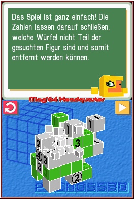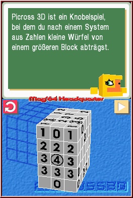 Wir wollen Euch an dieser Stelle die Spielregeln näher erklären. „Picross 3D" besteht aus einem Block, der sich wiederum aus vielen einzelnen Miniblöcken speist. Letztendlich ist die Größe aber soweit gleichgültig, da vor allem der Überblick im Spiel zählt. Und der ist in der 3D-Variante exzellent. Vor allem wegen der beinahe perfekten Steuerungsweise, mit welcher das Spiel aufwartet. Den eigentlichen Überblick verschafft man sich durch diverse Hinweise an den äußeren Bereichen der horizontalen und vertikalen Blockkonstrukte. Das Spielziel ist es, den gesamten Block so zu bearbeiten, dass sich letzten Endes ein Objekt offenbart, etwa ein Sportler, ein Hund oder ein Buchstabe. Um das Spiel zu beenden, stehen Euch Hinweise in Ziffernform zur Verfügung. Die Ziffern stehen dafür, wie viele Felder auszufüllen sind. Eine „5" bedeutet beispielsweise, dass fünf Blöcke in Folge abgestrichen werden können. Jene Reihe könnte selbstverständlich auch aus zehn Blöcken bestehen, fünf davon müssen jedoch in Folge markiert und dann aus dem Konstrukt gelöst werden. Steht die „5" am linken Rand des Spielfeldes, gilt die Zahlenfolge von links nach rechts, am oberen Rand des Bildschirms müsst Ihr die Felder von oben nach unten markieren. Selbstverständlich wisst Ihr zu diesem Zeitpunkt nicht, wo sich die fünf Kästchen in Folge befinden (geht man beispielsweise von einem 10x10-Block aus). Sollte in einem 10x10-Feld eine zehn am Rand markiert sein, könnt Ihr sicher sein, die gesamte Reihe anstreichen zu müssen. Natürlich gibt es weitere Angaben, die Euch unterstützend zur Seite stehen. Etwa eine Zahl, die in einem Kreis zu finden ist. Nehmen wir das Beispiel der „6", die sich in einem Kreis befindet. Dies bedeutet, dass in dieser Reihe insgesamt sechs Kästchen zum endgültig zu suchenden Objekt dazugehören, wobei sich diese in zwei Gruppen befinden müssen. Sprich: Mindestens ein Kästchen muss sich zwischen den zwei Gruppen als „Leerblock" befinden. Bei einer Zahl, die sich in einem Quadrat tummelt, bedeutet es, dass die zu suchende Blockanzahl in mindestens drei oder mehr Gruppen zu suchen ist. An das Ziel kommt Ihr wohl nur über das Ausschlussverfahren. Also dreht Ihr das Gesamtobjekt immer wieder von links nach rechts und von oben nach unten, zählt fleißig Blöcke ab, markiert Bereiche, die definitiv im Endbild dabei sein müssen und zerstört jene Blöcke, die nicht zum „Meisterwerk" dazugehören. In der 3D-Variante neu hinzugekommen: Jenes Schieber-Feature mit welchem Ihr Euch in die Konstrukte hinein bewegen könnt und dadurch einen Querschnitt der Block-Konstellation erzeugt. Nur wenn Ihr dieses Feature einzusetzen wisst, wird das Unterfangen auch gelingen können. Mit „platter" 2D-Ausschlussmechanik werdet Ihr schon bald an Eure persönlichen Grenzen stoßen.