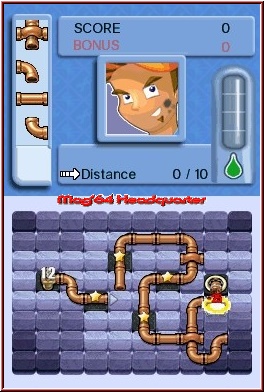 Unter dem Dach des bekannten Publishers Empire Interactive, zeichnen sich die Jungs von Razorworks für die DS Umsetzung verantwortlich. Auch keine Unbekannten in der Handheld Szene. Daher verwundert es auch nicht, das bei den Rahmenbedingungen vieles passt. Ihr bekommt ein komplett deutsches Spiel, ausgestattet mit einem bequemen Batteriespeicher via Autosave und dürft euch im Vergleich zum Original über reichlich neue Feature freuen. Streiten kann man über das Fehlen eines Mehrspieler Modus, der sich durchaus auch angeboten hätte, Aber na gut, auch so ein Puzzle Titel, der es für einen Spieler dennoch in sich hat. Selbst eine kleine Geschichte bietet der Titel, auch wenn man diese nicht zwingend erwartet. Auch für ein Drehbuch wird es nicht reichen. ;-) Hintergrund ist zunächst Alfonso Senior, ein Klempner der sich im Laufe seines Arbeitslebens ein kleines Vermögen erwirtschaftet hat. Im Ruhestand gönnt sich Alfonso ein kleines Inselparadies und freute sich eigentlich auf sein Rentner Dasein. Doch die Ruhe trügt auf der Insel der Rohre und der Schurke Buffalo Bonzo treibt hier sein Unwesen und versucht zusammen mit anderen Cowboy Klempnern das Chaos auf die Insel auf zu bringen. Doch da hat er die Rechnung ohne Alfonsos Kinder Fawcett und Junior gemacht. Diese machen sich auf, in Klempner Manier die Probleme zu meistern und Bonzo ein für allemal das Handwerk zu legen. Genau da kommt ihr als Spieler dazu und übernehmt die Geschicke der beiden. Natürlich eine etwas abgedreht Story, aber immer noch besser als es völlig trocken zu präsentieren.