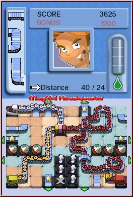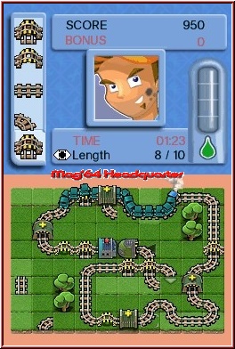 Alle Welten im Spiel haben nicht nur grafisch ein anderes Thema, sondern auch spielerisch hat das ganze einen sehr großen Einfluss auf das Gameplay. Kann man die erste Welt durchaus noch als halbes Tutorial durchgehen lassen, so kommt danach pro Welt immer was Neues im Gameplay dazu, so das es nicht langweilig wird. Logisch das man durch das Wertungssystem jedes Level so oft spielen kann wie man will. Ok schauen wir mal in die erste Welt und ich stelle euch hier zunächst mal das Gameplay in seinen Grundzügen vor. Passend zum Spiel ist die Welt 1 auch wirklich mit Rohren im herkömmlichen Sinne ausgestattet. Später wird’s noch verrückt genug. Bevor ein Level startet gibt’s die Scoregrenzen für Bronze, Silber und Gold. Wobei man sich Bronze fast hätte sparen können, da hier ein Score von 0 ausreicht. Also Bronze ist euch immer sicher. ;-) Klar abgesteckt sind die Regeln für die Screenaufteilung. Bietet der Top Screen alles mögliche an Infos und Anzeigen, so spielt sich die eigentliche Action auf dem Touch Screen ab. Sinnvoll auch deshalb weil man das ganze einmal mit der herkömmlichen Kreuz/Tasten Steuerung angehen kann, oder eben nur via Pen auf dem Touch Screen. Grundlage ist das Spielfeld, das aus 10x8 Feldern bestehen kann. Auf diesem Spielfeld gibt es einen Ausgangspunkt, einen Endpunkt und dazwischen viel Nichts oder bauliche Hindernisse. Der Anfangspunkt ist eigentlich nichts anderes als eine Art Schleuse, die thematisch in den Welten verschieden umgesetzt ist. Startet ein Level, so vergeht eine feste Zeitspanne in der erstmal nichts passiert. Ist diese Zeit runtergelaufen beginnt das sogenannte "Flooze" loszulegen. Wieder einfach gesagt dreht man den Hahn auf, Wasser fließt z.b. und sollte am besten bis zum Endpunkt fließen. Eure Aufgabe ist es nun den großen Bereich dazwischen mit Elementen zu bebauen, so dass das jeweilige Flooze ungehindert bis zum Endpunkt fließen kann. Hier kommt nun ein Art Tetris Gameplay zum Tragen. Links oben im Top Screen habt Ihr eine Teileliste, die übereinander nachrücken und euch immer ein Bauteil an die Hand geben. Die einfachsten Bauteile im Spiel können nun am Beispiel der Rohre gerade Stücke nach oben oder zur Seite sein, sowie gebogene Rohre um die Richtung zu ändern. Diese sollte man im Idealfall aneinander setzen um so nach und nach bis zum Endstück zu kommen. Soweit die einfache Theorie.