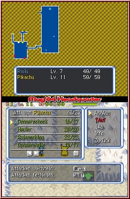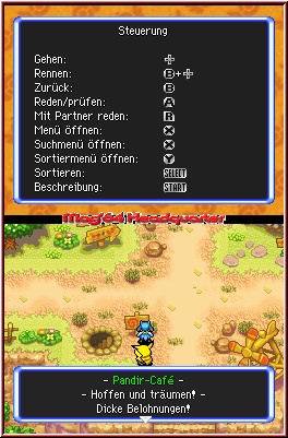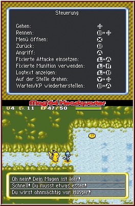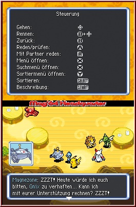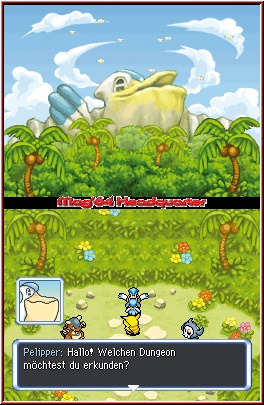 Sobald Ihr ein neues Spiel beginnt, sind die ersten Stunden durchaus ein langgezogenes Deja Vu Erlebnis für alle Spieler der Vorgänger, auch wenn allein die Startabfragen hier ein anderen Pokemon zutage fördern werden, in dessen Rolle ihr schlüpft. Die ungewöhnliche Geschichte des Spiels beginnt am Anfang damit, das Ihr euch in einem kleinen Frage-Antwort Spielchen wieder findet. Gleich nachdem euch die anfangs etwas fremd wirkende Story anhand einiger Szenen gezeigt wird. Dieses Frage-Antwort Spielchen dient dazu, ein wenig eure persönlichen Eigenschaften auf den bald folgenden Charakter übergehen zu lassen. Ihr bekommt hier mehrere Fragen zu bestimmten Situationen gestellt und dürft jeweils aus mehreren Antworten wählen. Aus diesen Antworten wird euer Spielcharakter ermittelt, sprich das Pokemon in dessen Rolle Ihr im Spiel schlüpfen werdet. Zu meinem Bedauern hatte ich diesmal nicht das Glück wieder ein Feuer Pokemon zu bekommen, sondern bin diesmal als Bisasam durch die Weiten des Spielsgezogen. Habt Ihr das nun hinter euch, beginnt die eigentliche Geschichte und Ihr findet euch an einem mysteriösen Strand wieder. Ihr werdet hier gefunden und dürft anschließend noch mal wählen. Diesmal den festen Mitstreiter im Spiel, der euch die gesamte Zeit über begleiten wird und den Kern des Teams bildet. Hier konnte ich meine Vorliebe für Feuer Pokemon dann doch noch ausleben und Glumanda war von nun mein Begleiter im erneut gegründeten Erkundungsteam Mag64. Ehe allerdings das Gameplay seine Facetten zeigt, schauen wir zunächst mal auf die technische Seite samt der Steuerung. Über den X-Knopf gelangt man im Spiel auf das Pausenmenu. In diesem hat man nun unter anderem die Möglichkeit Steuerung und Screenaufteilung anzupassen. So kann man z.b. in Sachen Steuerung das ganze auf Touch Screen Action a la Zelda einrichten, oder aber auch auf reine Tasten und Kreuz Action, die im Spiel auch wieder meine Wahl sein sollte. Dazu vor allem die Aufteilung der Screens. Auch hier seid Ihr recht frei in der Wahl. In meinen Augen am sinnvollsten ist die Aufteilung das die Action an sich auf dem Touch Screen zu sehen ist, während der Top Screen Karten, Status oder Info Einblendungen abdeckt. Gerade beim Thema Dungeons macht sich die dort dann darstellbare Karte am besten.