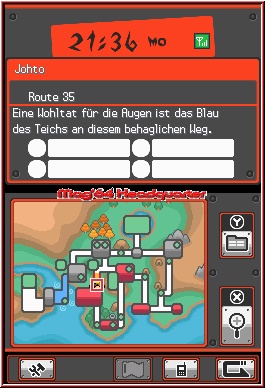 Wie mittlerweile eigentlich in allen Editionen, ist auch hier der Start wieder recht identisch. Wie immer gilt es den Helden ein wenig zu personalisieren. Erneut könnt Ihr beide Geschlechter auswählen und gebt euch am Ende einen Namen. Danach landet Ihr in der ersten Location – eurem Heimatdorf Neuborkia. In eurem Zimmer macht Ihr hier die ersten Gehversuche, wobei man zu Beginn erst mal wieder flucht, da die schnellen Treter noch nicht verfügbar sind, sprich der Held via Steuerkreuz zunächst äußerst langsam herum läuft. Heißt auch das die Steuerung und damit auch die Sichtweise identisch mit allen anderen Editionen ist. DS-technisch ist auch die grobe Screen Aufteilung geblieben. Eher auf den zweiten Blick entdeckt man kosmetische Dinge, die sich vor allem auf die Bedienung der Menus beziehen. Wie schon erwähnt spielt das Ganze in 2 kompletten Regionen, der alten GBC Zeiten. Ihr als Spieler erlebt zunächst die komplette Region Johto und könnt nach dem Erreichen der hier möglichen 8 Orden, auch nach Kanto reisen. Dabei ist das ganze keine Anhängsel, oder ist auf die Top Vier samt Ruhmeshalle beschränkt. Vielmehr ist Kanto das komplette Regionsgegenstück und bietet ebenfalls wieder neue 8 Arenen und damit Orden. Sprich Ihr erlebt hier in Sachen Umfang mit 16 Orden, schon ein echt fettes Spiel. Wobei man die Top Vier und deren Oberchef auch schon nach 8 erspielten Orden angehen kann und auch schafft. Nehme ich mein Spiel als Grundlage bin ich mit 60er Leveldödeln zu den Top Vier. Nach dem Eintrag in die Ruhmenshalle und dem Start in Kanto beginnen die dortigen Arenaleiter bei Level 40/50. Könnt euch also ausmalen, woher der Wind dann weht. ;-) 15 Stunden für eine Region kann man zeitlich ansetzen, auch wenn das nur eine oberflächliche Einschätzung darstellt.