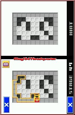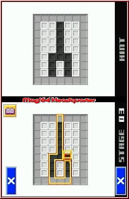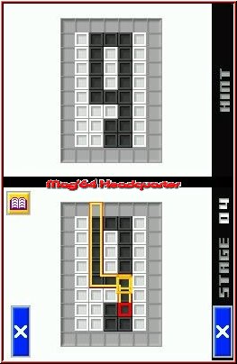 Wie bereits erwähnt ist das Spielprinzip leicht verständlich, der Schwierigkeitsgrad dagegen richtig knackig, was aber durchaus Sinn macht und dauerhaft motiviert. Im Touchscreen Eures Nintendo DS spielt sich das eigentliche Spiel ab, im oberen Screen seht Ihr entweder die herunter fallenden Tafeln ("Aufgaben"-Modus), oder aber eine Darstellung des unteren Screens samt Tipps, wie Ihr das Level am besten angehen solltet ("Taktik"-Modus). Hierfür werden - auf Wunsch - Punkte gesetzt, wobei diese den Start- beziehungsweise Endpunkt darstellen. Benutzt Ihr das interne Hilfesystem, wisst Ihr demnach, an welcher Stelle Ihr Euren Stylus ansetzen solltet und bis wohin Ihr ihn führen müsst. Logisch, dass es weitaus mehr Möglichkeiten gibt, einen Level erfolgreich zu beenden. Selbst mit der internen Hilfsstruktur, werden die späteren Levels Brett-hart, Ihr sitzt Minuten lang vor dem Bildschirm und brütet über dem gezeigten Muster. Bereits ab Level 30 wird es deftig schwer; wenn man sich vorstellt, dass es 100 Stages gibt, kann man sich ja vorstellen, was einen da erwartet.