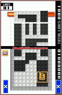 Doch bevor wir weiter im Spiel fortschreiten, werfen wir einen kurzen Blick auf das Hauptmenü. Im "Lounge"-Menü könnt Ihr Spieleinstellungen vornehmen, oder beispielsweise die Anleitung ein weiteres Mal lesen. Besonders lobenswert ist die Tatsache, dass Ihr eine Testversion von "Polarium" an einen Kumpel senden könnt, so dass dieser eine Demo des Spieles ohne Spielkarte anspielen darf. Vorbildlich, wie ich finde - hoffentlich macht dieses Beispiel Schule und wir werden in Zukunft häufiger Demoversionen drahtlos mit dem Nintendo DS an Freunde schicken können. Der "Kampf"-Modus stellt den Multiplayer dar, wobei dieser drahtlos mit einer oder mehr "Polarium"-Spielkarten gespielt werden kann. Doch dazu später mehr. Der "Aufgaben"-Modus ist das eigentliche "Tetris"-Pendant, da Ihr hier Reihen auflösen müsst. Ständig fallen von oben neue Tafeln herab, eine rote Markierung stellt eine Begrenzungslinie dar, welche nicht überschritten werden sollte. Anderen Falles ist das Spiel vorüber. Zu guter Letzt erwartet Euch das eigentliche Hauptspiel, der "Taktik"-Bereich. In diesem gilt es, 100 Puzzles zu lösen, wobei die Schwierigkeit darin besteht, den Touchpen in einer durchgehenden Linie zu führen, so dass der komplette Spielbildschirm von Tafeln befreit wird.