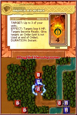 24 Szenarien ("Kampagne") gilt es während des Spielverlaufs in Angriff zu nehmen, laut Packungsrücken kommen "mehr als 200 strategische Karten" zum Einsatz, die Euer Deck von Kampf zu Kampf perfektionieren werden. Das Spielgeschehen findet auf einer Schlachtenkarte statt, die in simpler Von-oben-Grafik dargestellt wird. Im Grunde genommen ist es Euer Ziel mit einem von insgesamt neun Feldherren eine gewisse Anzahl an Siegpunkten zu erreichen, um die nächste Mission betreten zu dürfen. Die von Euch gesteuerte Armee in Form von kleinen Wappen ist minimalistisch in Szene gesetzt, in grafischer Hinsicht ist das Spiel alles andere als zeitgemäß. Mit den Euch zur Verfügung stehenden Karten bewegt Ihr zum einen Eure Mitstreiter auf dem Spielfeld, zum anderen nutzt Ihr einzelne Kartenbefehle, um beispielsweise Einheiten mit besonderen Effekten zu belegen, die Euch die unterschiedlichsten Vorteile bieten können.