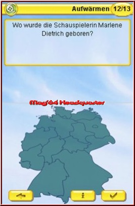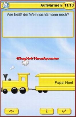 Wie schon bei „Wer wird Millionär" stehen Euch auch hier für gewöhnlich vier Antwortoptionen zur Wahl, von denen entweder eine, manchmal auch alle vier richtig sind. Weil es bekanntlich aber unterschiedliche Fragetypen gibt, wollen wir Euch im Folgenden die weiteren, auf Euch zukommenden Frageweisen vorstellen: Neben dem Standardtypus existiert die Fragestellung mit Ton, also ein Ton, den es zuzuordnen gilt. Oder Ihr sollt anhand einer Reglerfrage einen gewissen Wert mithilfe des Stylus einstellen („Wie viel Prozent vom Mond sehen wir?"). Hin und wieder ist es Eure Aufgabe, Gegenstände zuzuordnen, dann, wenn es beispielsweise heißt, Bauwerke ihrer Herkunft nach auszuwählen. Da fliegt dann mal der Eiffelturm durch das Bild und Ihr tippt diesen an – mit Sicherheit wisst Ihr, dass dieser in Frankreich steht. Ein anderer Fragetypus ist derjenige der Sortierung: Entsprechend der Frage bringt Ihr dann unter anderem Hauptstädte nach ihrer Lage in Reih‘ und Glied, später bedient Ihr auch einen Zeitstrahl, auf einem Wissenszug, der an Euch vorbeirauscht markiert Ihr vermeintlich richtige Antworten, auf einer topografischen Karte sucht und findet Ihr einen Ort („Wo ist XY geboren?") oder fahndet ähnlich des Galgenmännchenspiels nach richtigen Buchstaben innerhalb der Antwort. Manchmal bietet Euch das Programm auch ein Bild als Hilfestellung zur Beantwortung, wobei diese unseres Erachtens dann zu einfach ausfiel.
