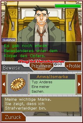Die Steuerung übernehmt Ihr wahlweise mit den Tasten des Nintendo DS oder aber komplett mit dem Stylus. Auch hier hat sich gegenüber dem Vorgänger nichts geändert, die intuitive und selbst für Einsteiger eingängige Spielsteuerung ist gelungen umgesetzt worden und geht bereits nach wenigen Minuten in Fleisch und Blut über. Selbsterklärend sind die diversen Buttons, die es zu bedienen gilt. Von äußerster Wichtigkeit ist die Gerichtsakte, die Phoenix Wright nicht nur im Gerichtssaal mit sich führt. Als eine Art Inventar trägt er hier alle Spiel entscheidenden Objekte mit sich, seien es Tatgegenstände oder aber ein Autopsiebericht eines Ermordeten. Beweise in Form von kurz nach einer Tat aufgenommenen Fotos findet Ihr hier ebenso wie ein spezielles Medaillon ("Magatama"), auf welches im Verlauf des Textes noch näher eingegangen wird.