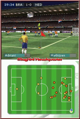 Das Spielgeschehen verfolgen wir über den Topscreen, während auf dem Touchscreen das Radar dargestellt wird um den Gesamtüberblick des Spielfeldes nicht zu verlieren. Mit der L Taste wechseln wir die Spieler, wenn wir nicht im Ballbesitz sind. Haben wir den Ball erkämpft, wird das gelbe Dreieck rot und nun ziehen wir unser Spiel auf.