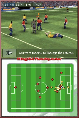 Wenn wir uns das Team ausgewählt haben gelangen wir zum Infoscreen, wo wir oberhalb die Tabelle im Auge haben und auf dem Touchscreen drei Buttons, welche uns zum nächsten Match bringt, die Statistikzentrale und zum Beenden navigiert. Nun folgt die Trikotauswahl, wobei wir darauf achten müssen, das wir sie so wählen, das man es richtig auf dem Feld unterscheiden können. Nun folgt der Taktikteil, dem wir uns stellen müssen. Auf dem Topscreen sehen wir die Startelf und die taktische Ausrichtung. Über den Touchscreen können wir direkt zum Anstoß gehen, oder aber erst einmal die Aufstellung und Spieler wechseln. In der Aufstellung stehen uns mehrere Formationen zur Verfügung. Vom traditionellen 4-4-2 bis hin zum 3-6-1 ist alles möglich. Über das Steuerkreuz kann man noch die Mannschaftsausrichtung von defensiv zu offensiv nachregulieren. Zu der gewählten Formation muß natürlich auch das Spielerpotenzial stimmen. Man sollte es vermeiden einen Stürmer in die Abwehr zu verbannen. Um das beste Potenzial der Spieler zu erkennen bekommen wir im Topscreen die nötigen Informationen geliefert. Dazu noch die Körpergröße, das Alter u.s.w. Auf dem Touchscreen sehen wir die komplette Mannschaft, mit dem Formbarometer, dessen Pfeile nach oben zeigen (Topform), die grünen Pfeile bedeuten Normalform und der rote Abwärtspfeil bedeutet, das man eine Alternative von der Bank aufstellen sollte. Mit einem drücken auf die L oder R Taste sehen wir die Frische der Spieler in Prozent. Die ist vor jedem Spiel bei 100%, baut aber im Spiel kontinuierlich ab.