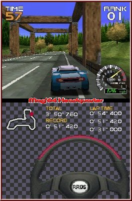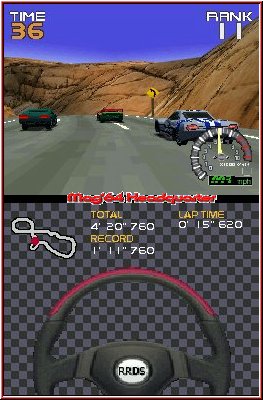 Leider fehlen Punkte auf der Karte für die gegnerischen Fahrzeuge. Hätte das Kartenfeature aufgewertet. Erst im Car Attack ist dies vorhanden. Dazu kommt auf dem Touch Screen ein Lenkrad samt Ganganzeige. Kein Gimmick, sondern vor allem für 2 der 3 Steuersetups wichtig. Fahren könnt Ihr Ridge Racer DS aus den vom N64 her schon gewohnten 3 Viewpoints , wobei sich die beiden hinter dem Fahrzeug wenig unterscheiden. Einstellbar mit der Select Taste bietet die InCar Perspektive eine sehr gute Übersicht, dafür aber diesmal ohne Rückspiegel. Dieser ist hier nun nicht mehr dabei. Ziel ist es nun wiegesagt in jedem Rennen erster zu werden. Dabei startet Ihr immer aus der letzten Position und müßt euch nach vorne kämpfen. Mit den ersten Wagen ist das Spiel zunächst sehr angenehm zu fahren und man kann sich erneut gut an die Steuerung gewöhnen. Wie schon erwähnt gibt es 3 Möglichkeiten. Das beginnt beim Easy Mode, wobei das Wort ein wenig falsch interpretiert werden kann. Denn diese Variante ist praktisch das was man schon immer gewöhnt ist. Ihr steuert den Wagen mit dem Kreuz und könnt mit A und B Gas geben. Das in diesem Modus keine anderen Tasten genutzt werden zeigt auch hier schon den Arcade Gedanken. Die anderen beiden Steuervarianten bedienen sich dann erneut dem Touch Screen. Der Hard Modus ist wieder für Linkshänder gedacht, wo zum einen Kreuz hoch und runter, sowie X und B für Gas und Bremse sind. Gelenkt wird nun einzig mit dem Touch Screen und dem darauf abgebildetet Lenkrad.