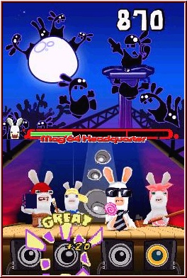 Man merkt hier übrigens sehr schnell das es vom Anspruch her total große Unterschiede gibt. Bei einigen Spielchen ist man sofort der Minispielgott, sprich man holt 15 Punkte, bei anderen dauerts eine Weile. Richtig unspielbar oder frustrierend schwer ist aber keines der enthaltenen Spielchen. Reaktionsspielchen gibt es ebenfalls mehr als genug. Mal müßt Ihr in wenigen Sekunden auf dem Top Screen vorgegeben Symbole nachzeichen, während euch später auch Merk und Denkspielchen erwarten. Wer die großen Versionen auf der Wii gespielt hat, wird zudem einige doch wieder erkennen. So z.b. die Hasen die am Strand auf dem Klo hocken und ihre Tür immer aufmachen wollen. Ihr müßt hier per Wischbewegungen den Dödeln immer wieder die Tür zuschlagen. Schaffen sie sich zu befreien, habt Ihr erneut das Klo Utensil auf dem Touch Screen. Bei anderen Spielen werden euch Reihenfolgen vorgebenen, die Ihr nachahmen müßt. Auch bekannt ist hier z.b. im Touch Screen eine Ansammlung von 5 Bunnies zu sehen, die sich über mehrere Durchgänge schreiend immer in einer festen Reihenfolge zeigen. Ihr müßt diese genau nachtippen und zu jeder neuen Runde kommt ein neuer Schreihals dazu. Das es auch richtig ermüdende Spielchen gibt liegt z.b. an denen, wo Ihr Bewegungen in bestimmten Richtungen und möglichst schnell ausführen müßt. Problem oder sagen wir gefährliche Ablenkung ist bei vielen Spielen, das diese im Top Screen komplett visualisiert sind, sprich irgendwie die Bunnies in kompletten Umgebungen eure Aktionen umsetzen. Man muß teils aufpassen sich mehr auf den Touch Screen zu konzentrieren, als nun dauernd nach oben zu schauen. Hektische Spiele sind natürlich auch dabei und sind hier in einem Beispiel immer das letzte pro Gebiet. Während im Top Screen auf einer Bühne eine lustige Bunnie Band Ihr bestes gibt, müßt Ihr im Touch Screen 4 Kreisanzeigen am Boden im Auge behalten. Je nach Rhythmus müßt Ihr nach unten fallende Symbole genau in diesen Kreisanzeigen erwischen wenn sie deckungsgleich sind. Je länger die Spiele dauern, sprich Runden um so schneller kommen diese und man hat gut zu tun, die 15 Punkte hier zu holen.