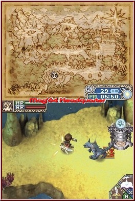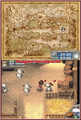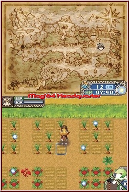 Rune Factory ist für mich als Redakteur mal wieder ein Spiel, bei dem man gar nicht so richtig weiß, wo man anfangen soll. ;-) Inhaltlich einiges drin, ist es hier mal wieder schwer einen roten Testfaden hin zu bekommen. Auch weil das Spiel bekanntes Gameplay der Harvest Moon Spiele mit neuen Inhalten, wie allein dem riesigen Thema RPG vermischt und vor allem dadurch einen ungeheuer großen Reiz ausspielt. Dabei ist das Spiel gerade zu Beginn oftmals sehr sparsam mit Informationen und lässt teilweise ungeheuer viel Content auf den Spieler los, der sich erstmal zurecht finden muss. Die ersten Stunden geht das so und man fühlt sich gerade zu Beginn teilweise etwas überfordert, um es mal vorsichtig auszudrücken. So nach dem Motto "10 Fragen hat man und 1 Antwort gibt es" ;-) Fangen wir einfach mal klein und einfach an. Natürlich wichtig ist das Thema Screenaufteilung. Hier geht das Spiel einen klaren Weg und bietet euch auf dem Touch Screen die eigentliche Action, während der Top Screen zum einen die Gesamtkarte von Kardia darstellt, und zudem erste wichtige Infos bereit hält. Neben Jahres- und Uhrzeit gibt’s ein Wettersymbol und der eigentliche Tag wird angezeigt. Neben normalen Wochentagen bietet Rune Factory natürlich auch Sonn- und Feiertage. Wenn wir gerade bei diesem Thema sind, kümmern wir uns auch gleich darum. Rune Factory bietet das gleiche System wie die Harvest Moon Spiele. 4 Jahreszeiten mit je 30 Tagen, wobei ein Tag in gut 15 Minuten vergeht, sofern man sich an Orten aufhält, an denen die Zeit auch verstreicht. Nur innerhalb von Gebäuden wird die Zeit angehalten. Alles andere in Sachen freier Natur und auch die enthaltenen Höhlen kommen mit dem Zeitfluss daher. Gerade in den Höhlen hier ein nicht zu unterschätzendes Thema. Doch vorher gibt es noch weitere "kleine Dinge" anzusprechen. Stichwort Sichtweise und Grundsteuerung. Auch hier ähnelt das Spiel der Harvest Moon Reihe. Ihr seht alle Geschehnisse aus der Iso Sicht über dem Helden und bewegt den Helden im kompletten 8-Way System durch die Gegend.