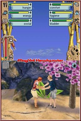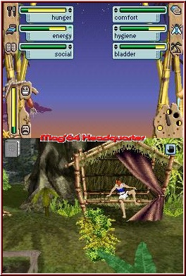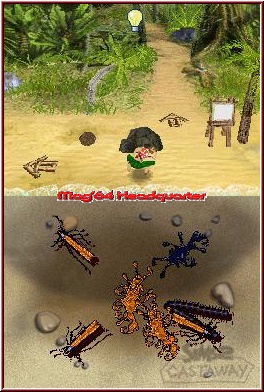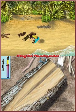 Aber nicht nur das: Wesentlich für den persönlichen Fortbestand sind regelmäßige Mahlzeiten. Gleich zu Beginn gelingt es Euch an einer offenen Feuerstelle ein Fünkchen zu entfachen, auf welchem Ihr dann im Folgenden Nahrung zubereiten dürft. Diverse Speisen stehen Euch nach und nach zur Verfügung, die je nach Magenzustand verspeist werden. Wie es sich für einen typischen Sims-Titel gehört, ist auch die obligatorische Bedürfnisanzeige mit von der Partie. Zu lange ein bestimmtes Bedürfnis vernachlässigt, führt direkt in die Ohnmacht. Demnach solltet Ihr insbesondere beim kleinsten Anzeichen eines Magenknurrens Essen herankarren. Energie erhält der Protagonist durch bestimmte Speisen, aber auch durch den kraftspendenden Mittagsschlaf. Gelungen finden wir, dass – je nach qualitativem Unterschlupf – die Auswirkungen auf den Zustand des Sims verschieden sind. Je mehr Handarbeit Ihr investiert habt, desto besser die Ausbeute im Bereich der Bedürfnisleiste. Zwar seid Ihr allein auf der Insel, dennoch ist Gesellschaft für einen Sim von grundlegender Bedeutung. Solltet Ihr später auf jemanden treffen, dem vielleicht das gleiche Schicksal widerfahren ist, umso besser. Zur Not lässt es sich aber auch mit einem Skelett unterhalten. Wie gewohnt drückt ab und an auch mal die Blase, wobei das Geschäft dann hinter dem nächsten Busch erledigt werden sollte, gewaschen wird sich in den umliegenden Gewässern. Ratsam ist es, auch die Klamotten regelmäßig zu bürsten, denn Waschmaschinen oder dergleichen findet man auf der einsamen Insel wohl auch nach langer Sucherei eher nicht. Dafür gibt es andere Dinge, die zur persönlichen Unterhaltung dienlich sind, beispielsweise das fröhliche Herumgeplansche im nächsten Tümpel. Dass zunächst nicht der gesamte Inselbereich zugänglich ist, sollte klar sein, aber durch den Einsatz von Werkzeugen, die Ihr im Laufe des Spieles herstellen könnt, macht Ihr neue Wege zugänglich und entdeckt Landschaften, die wiederum mit vielen neuartigen Spielereien aufwarten. Apropos Spielereien: Auch Minigames sind mit von der Partie, die sich – wie das Spiel selbst („Point and Click") – über den Touchscreen steuern lassen. Feuer entfacht Ihr mit Kleinholz, dessen ungeachtet ist auch das notwendige Wissen vonnöten, um den Funken nicht wieder zu ersticken. Reibt Ihr über den Scheit und pustet ab und zu in das DS-eigene Mikrofon, sollte das Feuer aber entflammen. Zur gegenseitigen Unterhaltung ist das Instrumentenspiel hervorragend – wen Ihr zunächst unterhalten sollt, ist allerdings noch fraglich. Nur dass eine von der „The Legend of Zelda"-Serie inspirierte Okarina zum Einsatz kommt, ist sicher ;-) . Käfer zu jagen macht mit dem Stylus ebenso Spaß, gleichsam das Speerfischen, bei welchem Ihr im rechten Moment die umherstreifenden Fische aufspießen müsst. Auch das gewöhnliche Angelfischen wurde im Leben auf der Insel in das Spiel integriert – was man nicht alles für den zehrenden Hunger so tut...