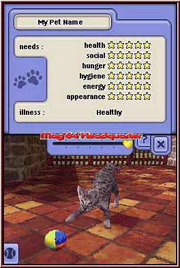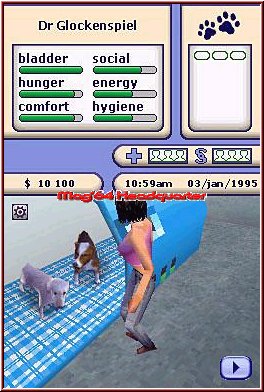 Aus einer Schräg-von-oben-Perspektive steuert Ihr den Sim durch die Stadt und lasst ihn allerlei Häuser betreten. In der Tierklinik könnt Ihr Euer Haustier versorgen lassen, im örtlichen Trainingszentrum lassen sich neue Tricks für den Vierbeiner erstehen. So lernt ein/e Hund/Katze zu betteln, einen Rückwärtssalto auszuführen oder - für besonders ausgefallene Tierbesitzer - auf den Hinterbeinen stehend gleichzeitig drei Objekte zu jonglieren. Bei "Adeles Eck' für Tiere" dürft Ihr - bei Bedarf - den Liebling in Obhut geben und ihn auf Wunsch wieder abholen. Obligatorisch finden sich Geschäfte, deren Inventar zum Verschönern Eurer Wohnung dient. Luxuriöse Einrichtungsgegenstände bereichern die im Spiel verfügbaren Behausungen. Natürlich solltet Ihr Bares im Geldbeutel vorweisen können, um ausgiebig shoppen zu können. Hier müsst Ihr - neben Eurem Dasein als Tierbesitzer - kleineren Nebenbeschäftigungen nachgehen, um Geld zum Leben zu verdienen. So ist es möglich zum einen Müll im Stadtpark und der näheren Umgebung sammeln. Zeitungen, Glasflaschen, Aluminiumdosen, Batterien, seltene blaue Trüffel bis hin zu rubinroten Pinguinen wollen von Euch aufgeklaubt und gewinnbringend verscherbelt werden. Oder Ihr begebt Euch in einer Art Minispiel als virtueller Tier-Aufpasser auf einen Spaziergang. Hier gilt es den Hund an der Leine zu halten und seine eventuellen "Wegmarkierungen" unverzüglich wegzuwischen. Selbst die Tierparapsychologie ist im Spiel möglich. Ein gut besuchter Ort ist der Amseldamer Kompagnon-Club, in welchem man andere Tierhalter antrifft und Gespräche führt. Leider besteht das Spielziel im Grunde genommen darin, in allen Bereichen (Tiertraining, Freundschaften, etc.) "besser" zu werden, um somit Karrierepunkte einzusacken. Der Haustier-Zusatz ist leider kein wirklich sinnvolles Spielelement, sondern einfach ein zugkräftiges Verkaufsargument. Bloßes Spielen mit dem Hund oder diesem einige Tricks beizubringen, motiviert auf Dauer nicht. Hier hätten sich die Entwickler eher an den Game Boy Advance-Vorgänger halten sollen.