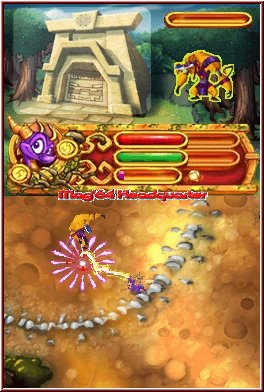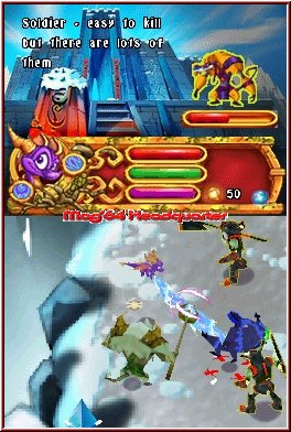 Etwas ungewöhnlich ist hier das Thema Optionen gelöst. Vorhanden sind diese schon. Nur eben hier erreichbar über das Pausenmenu im Spiel selber. Dort findet man neben soundtechnischen Dingen z.b. auch die Möglichkeit das Rumble Feature zu aktivieren. Wenn Nintendo nun noch das DS Rumble Pak mal auf den Markt bringt, wäre das sicher ein erwähnenswertes Feature. ;-) Etwas das mir persönlich nie gefällt findet man aber auch in den Optionen. Ihr könnt hier während des Spiels fix mal den Schwierigkeitsgrad ändern. Die Versuchung ist immer groß wenn man diese Möglichkeit hat ihn zu verändern. Wiegesagt persönlich bin ich kein Freund dieses Features. Die DS Version von A New Beginning ist wie der GBA Bruder eine Abkehr vom Kristallsammelnden Jumper Helden alter Tage. Auch hier darf sich der Spieler wie auf dem GBA der 4 Attacken Klassen des kleinen Drachens bedienen. So überrascht es auch nicht das Spyro hier ebenfalls mehr ein Action Titel geworden ist. Wobei zumindest die Sichtweise ähnlich ist wie in früheren Zeiten. Während des Spiels schaut Ihr hier in einer Iso Sicht von oben auf das Geschehen. Das 2D Gameplay der GBA Version findet man hier also nicht vor. Die Reise des Spielers beginnt auch hier am Heimatort des lila Rackers, samt der Begegnung mit einem der Wächter des Drachentempels, der Spyro ob seiner Aufgabe und Bestimmung informiert. Eingeteilt ist das Spiel grob in 4+ Welten. Neben den 4 Hauptwelten im Spiel existieren Abschnitte davor und am Ende. Gerade der Anfang ist auch hier recht positiv als Einstimmung gedacht und bietet sich als Tutorial an. In Sachen Screens folgt die DS Versionen festen Gesetzen. Während im Touch Screen die eigentliche Action tobt, sorgt der Top Screen für Infos und Übersichten. So werden euch dort verschiedene Leisten angezeigt, die unter anderem die Lebensenergie wiederspiegeln, sowie Spyros magische Ressourcen um seine Special Attacken zu benutzen. Positiv das man auch hier vom Sparx System abgewichen ist und ihm endlich eine richtige Lebensleiste spendiert hat.