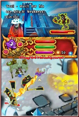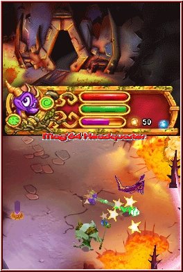 Trotz Iso Sicht besitzt Spyro auch in diesem Spiel eine Sprung und auch Schwebe Funktion. Läuft man per Kreuz durch die Gegend, sorgt die B-Taste bei einmaligem Drücken für eine Sprung und bei gehaltener Taste für das Schweben. Etwas das er erst später lernt um kleinere Schluchten zu überwinden, oder in der Luft eine Attacke folgen zu lassen. Auch dies ist für Spyro Spieler nichts neues und Ihr könnt per Y-Taste die Rammattacke ausführen. Tut Ihr dies in der Luft macht er einen Wirbelschlag um sich herum, um damit mehrere Gegner attackieren zu können. Die Ziele im Spiel sind in 2 Bereiche eingeteilt. Zum einen gilt es in den Welten die Wächter zu befreien, während das sekundäre Ziel im Finden der Splitter liegt, die man unter anderem für die Extras benötigt. Lohn nach dem Befreien der Wächter, was hier die Drachenältesten sind, sind die 4 Attacken Klassen, Feuer, Elektro, Erde und Eis. Nur mit deren Hilfe kommt man überhaupt durch das Spiel. Dabei baut das Spiel aber nun angenehm langsam auf und überzeugt vor allem durch den sehr guten Einsatz des Touch Screens, weshalb man die Action nicht ohne Grund auf diesen Screen gesetzt hat. Zwar läuft man z.b. per Kreuz und tätigt diverse Attacken mittels der Action Tasten. Der Touch Screen hat aber dennoch ebenfalls seine Aufgaben. Einfaches Beispiel sind Hindernisse oder kaputtbare Umgebungsobjekte. Kommt man einmal z.b. an einem Weg nicht weiter kann man in der Nähe eine Steinschleuder finden, die man mittels Ziehbewegung auf dem TS spannt und abschießt und so einen Weg öffnet. Dazu stehen und liegen immer wieder diverse Objekte wie Tonnen, Fässer oder Steine herum, die man mittels Tipp Bewegung auf dem TS zerstören kann und darunter weitere Kristalle findet. Und schon finde ich so langsam den Übergang zum tiefgehenden Gameplay im Spiel. Versteckt unter der Haube hat das Game auch einen kleinen RPG Modus. Da euch massig Feinde erwarten, etwas logischerweise nützliches. Für alle 4 Klassen existieren im Spiel je 3 Attacken. Bei der ersten Klasse, die wie immer das Feuer darstellt erlernt Spyro so mit der Zeit den Feueratem, den Feuerball und das Feuerschild.