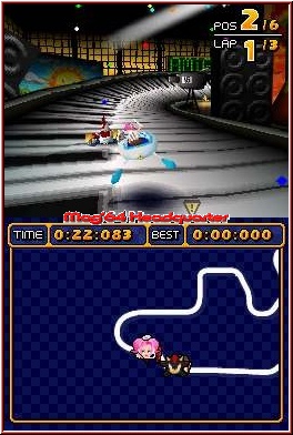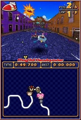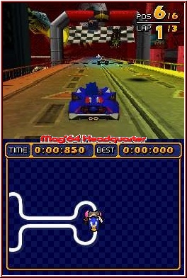 Grafisch muss sich der Titel nicht verstecken und überzeugt vor allem durch viele Details. Grund dafür dürften natürlich auch die enthaltenen Serien sein. Denn jede hat logischerweise mindestens eine passende Strecke im Spiel, wobei auch hier Sonic & Co mit mehreren vertreten sind. Dabei gefallen die Strecken vor allem durch viele kleinere Animationen, die oftmals eine gewisse Lebendigkeit erzeugen. Dazu kommen die Animationen der Charaktere und auch die Gestaltung der Fahrzeuge an sich. Großes Lob gibt es für die Strecken. Zwar gibt es immer Ausnahmen, die einen nicht so vom Hocker hauen. Aber mal abgesehen von vielleicht 5 Strecken überzeugen die anderen sehr. Zum einen angenehm lang, sind viele Strecken auch angenehm Breit und bieten nicht zu Leichte, aber auch nicht zu Schwere Streckenführungen. Eigentlich genau richtig für einen Funracer. Besonders im Hinblick auf den Mehrspieler. Viele Höhenunterschiede, verschiedene Lichtverhältnisse und thematische Umgebungen gehören klar zum Besseren auf dem DS. Was ein wenig zu kurz gekommen ist, sind versteckte Abkürzungen. Hat man die Strecken ein paar mal gefahren, sind kaum Geheimnisse der Streckenführung noch offen. Auch technisch weiß der Titel durchaus zu überzeugen. Neben der guten Übersicht, den oftmals breiten Strecken punktet auch der Speed des Spiels. Genau richtig rempelt man nicht unkontrolliert in der Gegend herum, schläft aber auf einer langen Gerade auch nicht gleich ein. Die Kollisionsabfrage passt, so das man hier eigentlich kaum etwas Negative findet. Wenn dann sind es wie so oft subjektive Dinge.