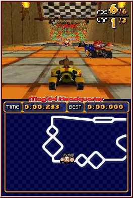 Wählt man einen Pokal an, bekommt man kurz die 4 Strecken angezeigt und nach einer kurzen Ladezeit beginnt auch schon das erste der 4 Rennen. Positiv finde ich das man nicht jederzeit Abbrechen kann. Einmal begonnen muss man auch zu Ende fahren, und kann nicht bei einem schlechten Rennverlauf einfach noch mal Starten. Gefahren werden dabei die Rennen über die üblichen 3 Runden. Fest eingeteilt ist nun die Aufteilung der Screens. Während auf dem Top Screen die eigentliche Action tobt, wird auf dem Touch Screen die Streckenkarte samt Gegnerköpfen dargestellt und die Zeitanzeigen werden hier eingeblendet. Hier geht man einen sehr übersichtlichen Weg. Denn auch im Top Screen findet man nur noch die Rundenanzeige samt Platzierung. Für die Übersicht durchaus positiv. Eher Negativ sehe ich die Anzahl der CPU Gegner. Denn neben eurem Helden streiten sich nur 5 weitere CPU Recken um den Sieg, so das man hier nicht umsonst das alte Formel 1 Punktesystem nutzt. Dennoch wünscht man sich irgendwie doch derer 7. Und technisch sollte das heutzutage doch wohl kein Problem sein. Finde ich zumindest ein wenig schade. Gefahren wird in All-Stars Racing nur über einen festen Viewpoint. Allerdings kein Kritikpunkt, da der gebotene sehr gut getroffen ist. Entfernt hinter dem Fahrzeug und etwas erhöht hat man hier eine sehr gute Übersicht. Sobald die Action losgeht, kann man innerhalb des Counters einen Frühstart provozieren und los geht die Jagd nach dem Sieg. Fast schon Überlebenswichtig ist die Steuerung in einem Titel wie diesem. Zunächst folgt das Spiel alten Konventionen und dürfte damit den Kreuz/Tasten Spielern sehr entgegen kommen. Während man logischerweise mit dem Kreuz steuert, gibt man mit der A-Taste Gas und kann mittels B oder R Bremsen. Wobei man hier eine kleine Einschränkung machen muss. Eine richtige Bremse in dem Sinne gibt es eigentlich gar nicht. Denn mit B und R wird der Wagen zwar abgebremst, aber gleichzeitig deckt man damit auch den Drift ab. Richtiggehend Bremsen kann man nur beim Geradeausfahren. In Kurven fängt der Wagen sofort an zu Driften. Ungewohnt und vor allem in wirklich engen und kurvigen Abschnitt nicht immer ideal.