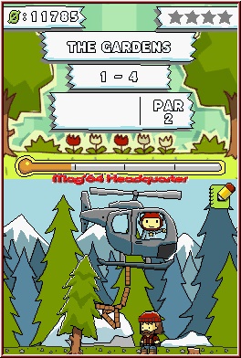 Gegenstände erschaffen und damit knifflige Rätsel lösen, einen Fleischer einsetzen, um einen wilden Hund zu erledigen, Dynamit, um ein Loch in den Boden zu sprengen, Klebstoff, um lustige Dinge an anderen Objekten im Spiel zu befestigen. Die Möglichkeiten sind unbegrenzt, das Spiel gibt Euch die Vorgaben, Ihr bringt die Fantasie mit! Eine Story gibt es keine, Ihr steuert Maxwell, einen rotbemützten, Kopfhörer tragenden Knilch, der auf der Suche nach den Starites ist. Ein Starite ist ein Stern, den es zu erreichen gilt, um das aktuelle Level erfolgreich abzuschließen. Sowohl Rätsel- als auch Aktions-Levels erwarten Euch in „Scribblenauts". Erstere existieren in 110 Ausführungen: Zehn Welten mit jeweils elf Rätsel-Levels sind das Ziel Eurer Reise. Zunächst wird Euch die Ausgangssituation erklärt. Ein fiktives Beispiel ist einfach zu finden. Ein kleines Kind sitzt verletzt am Straßenrand und hat sich beim Spielen den Fuß aufgeschlagen. Das Kind blutet. Der Starite erscheint nur dann, wenn Ihr dem Kleinen das richtige Objekt beschafft, in diesem Fall ein Pflaster. Was aber nicht heißen soll, dass es nicht auch mit einem Tuch funktionieren könnte. Die Lösungsmöglichkeiten sind vielfältig, warum also nicht einen Arzt „herbeizaubern", der Euch zur Hand geht und dem Kind hilft? 110 weitere Action-Levels stellen den zweiten Teil des Spieles dar. In diesen ist der Starite von Anfang an sichtbar, es gilt, diesen zu erreichen, was aber alles andere als einfach wird. Der Aktionspart zeigt den wirklichen Anspruch, den der Titel auf der Pfanne hat. „Scribblenauts" ist nichts für Anfängernaturen, dazu sind die Aufgaben oftmals zu schwammig gestellt, das Ziel nicht immer offensichtlich genug, um selbst Jungspunde vor den Handheld-Bildschirm zu bitten.