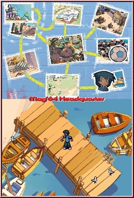 Dazu gehört dann auch das man wahlweise über Gespräche und eben das Lösen diverser Minispiele die einzelnen Verbindungswege zwischen diesen Orten frei schaltet. Während Ihr hier also herum lauft unterstützt euch dabei immer die auf dem Top Screen dargestellte Karte von Marienhafen. Steuern könnt Ihr Fangus wahlweise per Kreuz oder auch Zelda like durch Antippen eines Punktes auf dem Touch Screen. Der Kern des eigentlichen Gameplays sind aber nun die Minispiele und Matches gegen die anderen Teams. Ehe man aber das erste mal gegen eine andere Mannschaft antritt erlebt man erstmal einiges an Minispiel Action. Wie schon erwähnt ist ein vorankommen in der Story nur dann möglich, wenn man verschiedene Charaktere trifft, die einem nur dann helfen wenn man die angesprochenen Minispiele löst. Diese bieten euch mit 18 Stück eine durchaus passende Anzahl, die in der Umsetzung aber gelungen variieren. Eines haben sie aber gemein. Der Ball spielt eine Rolle, auch wenn es mit einem normalen Fußballspiel nur selten etwas zu tun hat. Diese Spielchen teilen sich nun in solche, bei denen man per Touch Screen oder Mikro agiert, oder aber auch per Tasten und Kreuz Einsatz zurecht kommt. Ein paar Beispiele sollen euch das zeigen. Einfache Spielchen zu Beginn bedienen sich des Geschicklichkeitsprinzips. In einigen werden z.b. beide Screens genutzt. Hier fällt ein Ball z.b. aus dem Top Screen in den Touch Screen herunter. Dort sieht man Fangus der sich automatisch und scrollend von links nach rechts bewegt. Euer Ziel ist es Fangus mit dem Pen anzutippen und zu halten. Jetzt kann man ihn wild hin und her bewegen und sollte möglichst den Ball auf den Kopf bekommen. Dieser springt dann wieder nach oben und sollte so mehrere mal geköpft werden. Dieses Spielchen gibt es z.b. auch ohne Fangus und man muss nur den Ball vor dem Fall auf den Boden bewahren. Reichen mit Fangus z.b. 4 Kopfbälle, so muss es in der Ball only Variante knapp 30 mal antippend vonstatten gehen.