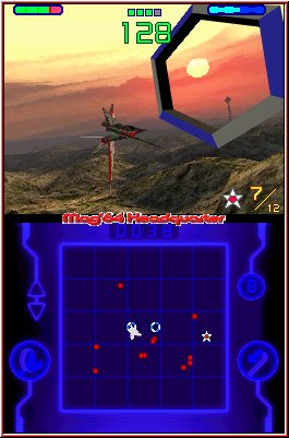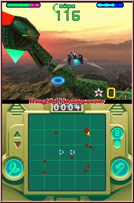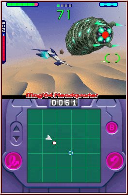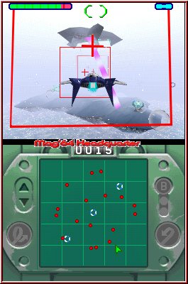 Sobald Ihr eine neues Spiel startet landet Ihr am Anfang der Geschichte, die hier wie im gesamten Spiel über kleine Sequenzen samt Texten und der eigentümlichen Sprachausgabe umgesetzt ist. Am Ende der Einführung landet Ihr auf dem was von nun an immer der Ausgangspunkt ist. Wenig überraschend ist die Basis wenn man so will die Great Fox, wo ROB als eure Unterstützung agiert und euch mit Infos und sonstiger Unterstützung zur Seite steht. Ihr könnt am Anfang nun wählen ob Ihr das Spiel sofort starten wollt, oder ob ein Trainingsmodus genutzt werden soll. Kleine Tutorials die euch die Facetten der Steuerung näherbringen und die Ihr in kleinen Aufgaben nachmachen müßt. Ich würde das Training durchaus empfehlen, zeigt es doch schnell was hier Sache ist. Denn wie schon erwähnt ist die Steuerung für mich ein Diskussionspunkt. 4 Setups existieren, die alle zwei Dinge gemeinsam haben. Alle Tasten des DS dienen zum Abfeuern der Laser oder Plasma Geschosse. Lenken, Manöver und sonstige Aktionen werden per Touch Screen getätigt. Dabei teilen sich die Setups jeweils in 2 Varianten mit und ohne Rumble Pak Unterstützung. Man sollte aber unbedingt mit diesem Spielen wenn man es zur Verfügung hat. Danach unterscheidet sich das ganze nur noch in der Art der Achsen Umsetzung, und ob der Wing bei Pen Bewegungen nach oben auch nach oben fliegen soll oder eben umgekehrt die Nase des Wing senkt. Die erste Trainingsmission befaßt sich dann logischerweise auch mit diesem Thema. Ihr seht natürlich das Geschehen aus der Third Person Perspektive. Dabei wird auf dem Top Screen die Action in den 3D Arealen dargestellt. Auf dem Touch Screen wiederum findet man nun eine große Radaranzeige, samt kleiner Symbole links und rechts daneben. Fliegt der Wing ohne euer zutun mittig im Top Screen geradeaus, so bewirkt eine Pen Bewegung auf dem Touch Screen nach links auch eine entsprechende Richtungs Änderung des Wings. Je nach Achsenwahl ist also rein die freie Bewegung über den Touch Screen für die Steuerung des Wings verantwortlich. Aktionen wie der Looping und die Wende werden über 2 Symbole getätigt. Man tippt sie an und schon vollführt Ihr diese Aktion. Das war aber noch nicht alles. Per schneller Wischbewegung nach links und rechts auf dem TS wird die Rolle ausgeführt um Geschossen auszuweichen, oder um bestimmte Endgegner zu erledigen.
