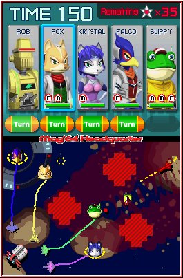 Ihr als Spieler habt ebenfalls die Möglichkeit über ein Menu alte gelöste Missionen nochmal zu spielen um vielleicht einen höheren Score zu erspielen, den das Spiel ebenfalls bietet. Ausgangspunkt aller Missionen ist die Great Fox, die natürlich nicht fehlen darf. Von hier aus starten die einzelnen Missionen, die in ihrer Umsetzung auch einiges neues bieten. Wenn man so will ist Starfox Command in 2 Gameplay Teile eingeteilt. Eine taktische Komponente und natürlich die 3D Flugaction. Der taktische Teil bringt dann Aspekte wie Kriegsnebel, Truppen ziehen und natürlich eine Prise Taktik mit in das Spiel. Diverse Rahmenbedingungen für eine Mission kommen ebenfalls mit dazu, so das man hier also die Action erstmal ein wenig anders angeht. Schauen wir uns an wie das ganze aufgebaut ist. Dabei bieten die Missionen in Sachen Aufträgen verschiedene Facetten. Mal müßt Ihr einfach nur Feinde eliminieren, Boss Gegner zur Strecke bringen oder eben auch Team Mitglieder zu Hilfe eilen. Startet eine Mission werdet Ihr von Rob instruiert. Danach landet Ihr als Erstes immer auf dem Taktik Screen, was nichts anderes als eine Karte ist. Diese wird auf dem Touch Screen dargestellt, während auf dem Top Screen die verfügbaren Team Mitglieder angezeigt werden. Zu Beginn einzig Rob samt Great Fox und der gute Fox mit seinem Airwing II selber. Grob gesagt müssen nun die Aufträge in einem bestimmten Zeitlimit in festgelegten Zügen erledigt werden. So starten die Missionen z.b. mit 150 Sekunden Zeitlimit und 3 oder 4 Zügen die Ihr machen könnt. Auf der Karte erscheint nun die Great Fox und Fox selber als kleine Symbole. Beginnt ein Zug kann man Fox nun verschieben und eine Linie zeichnen, welche die Flugroute darstellen soll. Da Sprit eine Rolle spielt ist diese Linie begrenzt. Auf der Karte gibt es nun verschiedene aktive und passive Symbole. Ihr könnt so z.b. über ein Raketensymbol fliegen um der Great Fox eine Abwehrwaffe zu ermöglichen, Sprit und Zeitsymbole überfliegen um diese Bereiche zu erweitern. Dazu kommen nun die Gegner in Form aktiver, also beweglicher Punkte. Oben rechts erscheint nun die Anzeige für die sogenannten Energiekerne. Steht dort z.b. eine 19 gilt es 19 Gegner zu eliminieren in diesem Auftrag. Diese reichen von den angesprochenen beweglichen Zielen, die nach der Great Fox trachten und eben den Mutterschiffen der Gegner, die man finden muß.