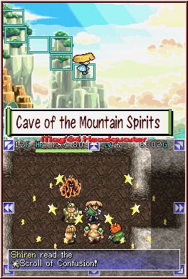Das Gameplay ist auch in anderen Bereichen nicht ganz mit heutigen Vertretern zu vergleichen. Auch dies lernt man schnell schon im Tutorial Bereich kennen. Die Umgebungen und begehbaren Abschnitte sind mit festen Wegen gespickt, die man meist in kleinen Korridoren einfach nur in 2 Richtungen ablaufen kann. Verbunden mit kleinen Lichtungen und Screengroßen Arealen, wo man bestimmte Gegner und auch Items findet. Findet man entsprechende Items, sammelt diese Shiren sofort auf. Entweder man nutzt sie sofort, wie z.b. Heilitems für die eigenen HP Leiste, oder aber man steckt es in das Inventory wie z.b. Waffen. Möchte man etwas davon nutzen, begibt man sich per X oder B-Taste dorthin und legt es direkt an. Grob gibt es in Sachen Ausrüstungen nur 3 Möglichkeiten. Einfach gesagt nur die Hände und eine Armreiffunktion, so das man z.b. neben einer Waffe auch nur ein Schild tragen kann. Angelegte Dinge verbessern die Punkte Angriff und Verteidigung, was man auch visuell bei der Kampfaction zu sehen bekommt. Weniger allerdings in den Status Screens selber. Gerade wenn man mehrere Waffen findet, will man ja auch wissen ob es sich zum aktuell angelegten Gegenstand auch lohnt. Shiren beherrscht dabei auch das Thema Magie und kann sogenannten Schriftrollen nutzen um Element Attacken herbei zu rufen oder auch später um sich selber in Monster zu verwandeln. Das Kampfsystem kommt dieser Art der Nutzung über das Inventory Menu entgegen. Denn gekämpft wird im Spiel Rundenbasiert, wobei das System hier so gehalten ist, das bei einer Aktion in der eigenen Runde auch der oder die Gegner agieren können ohne aber zu attackieren. Die Art und Weise wie gekämpft wird ist zunächst recht simpel gehalten. Auf seinem Weg stellen sich Shiren im Gesamten bis zu 180 Gegnertypen in den Weg. Mal mehr oder weniger schwer sind diese immer sichtbar, sprich hier greift kein Zufallsprinzip wie z.b. in den Pokemon Spielen. Stehen sich die Kontrahenten gegenüber könnt Ihr nun wahlweise per Fernwaffen, die es ebenfalls gibt per L-Taste agieren, oder eben mit dem aktuell getragenen Schwert mittels A-Taste loslegen. Nacheinander seid nun Ihr und der Gegner an der Reihe, was vor allem bei mehreren Gegner auf einmal erste Frustmomente mit sich bringt. Da bei eigenen Aktionen die Gegner ebenfalls agieren können, kann man selten einen Bewegungsvorteil erringen und ertappt sich bei mehr als 2 Gegnern auf einmal nur noch beim Reagieren und nicht beim Agieren. Nicht der einzige Punkt, der dem Spiel einen hohen Frustfaktor beschweren sollte.