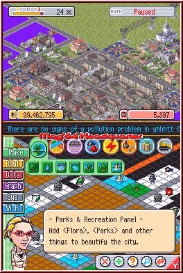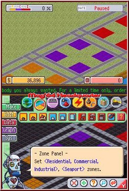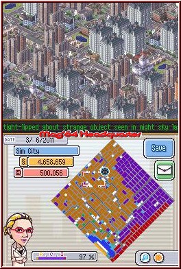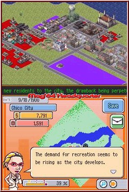 Erstmal diese paar Dinge platzieren und man verläßt das Baumenu. Erst jetzt verläßt das Spiel ja auch wieder den Pausenmodus und auf dem Top Screen kann man nun die Entwicklung verfolgen. Auf den noch farblich unterlegten Abschnitten entstehen plötzlich die ersten Siedlungen und die ersten Leute ziehen in die Stadt. Von nun an baut sich das Spiel wunderbar auf. Ihr müßt auf erste Ausschläge der Balkenanzeige reagieren und erweitert nach und nach das erste bebaute Gebiet. Zu beginn mit vielleicht gestarteten 20.000 Dollar reicht das Geld noch dicke. Verdienen tut man am Anfang noch wenig. Wenn überhaupt ein paar Hunderter pro Monat. Der Tiefgang startet, sobald sich das erste Gebiet entwickelt. Ihr braucht eine Mülldeponie, müßt Schulen und sonstige Behörden bauen und das Straßensystem erweitern. Mit der Zeit bekommt Ihr nun die angesprochenen freischaltbaren Bonusobjekte. Das beginnt bei normalen Dingen wie der Eisenbahn, neuen Behörden oder Kraftwerken und endet in den zahlreichen Bonusbauten, die teilweise nichts kosten, aber nur einmal verfügbar sind. Wie eben z.b. das Postamt das euch den Mailservice öffnet. Problem ist das ständige reagieren. Ich meine habt Ihr eure Stadt teilweise gut angelegt und plötzlich erscheint die Meldung "die Eisenbahn ist verfügbar" und Ihr habt ein Problem. Einbinden in das bebaute Gebiet ist schwer, ohne vorhandenes abzureißen. Also baut man sie erstmal drumherum, muß aber nun wieder alles neue anpassen. Plötzlich beginnen auch noch die Menschen Forderungen zu stellen. Ein System das man zwar abstellen kann, aber in meinen Augen trotz manchmal nerviger Häufigkeit sehr sinnvoll sein kann. Denn sie sagen euch was in der Stadt fehlt. Denn Veränderungen und das Eingehen auf diese Wünsche wirkt sich aus. Denn habt Ihr einmal lange genug gespielt gibt es reichlich Möglichkeiten das ganze zu pushen. Bestes Beispiel sind Wohnhäuser. 3 verschiedene Stufen kann man selber bauen. Von einfachen Hütten über richtige Blocks. Allerdings entwickeln sich diese vielleicht nicht. Also baut man drumherum z.b. ein Stadion oder einen Park. Siehe da das berühmte A-Train Prinzip greift und der Grundstückswert steigt. Ist das der Fall könnt Ihr verfolgen wie z.b. aus 4 aneinanderliegenden Reihenhäusern plötzlich ein Wolkenkratzer entsteht. Vorteil ist das Ihr mehr Menschen darin wohnen lassen könnt, ohne neues Gebiet dafür zu nutzen. Spätestens wenn eure Karte komplett zugebaut ist beginnt Ihr mit solchen Sachen.