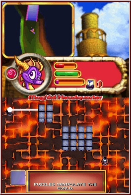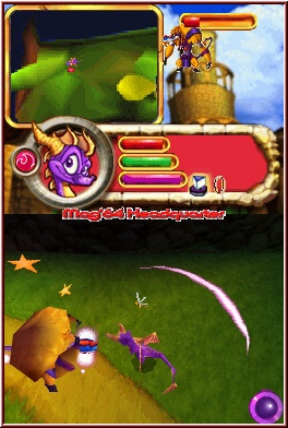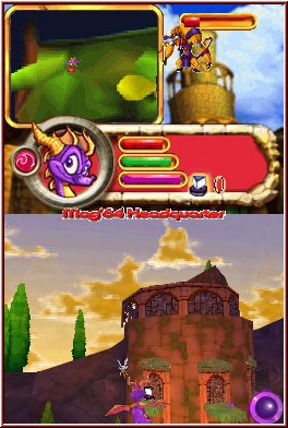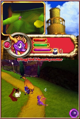 Eingeteilt ist das Spiel erneut grob in 4+ Welten. Neben den 4 Hauptwelten im Spiel existieren Abschnitte davor und am Ende. Gerade der Anfang ist auch hier recht positiv als Einstimmung gedacht und bietet sich als Tutorial an. In Sachen Screens folgt die DS Versionen festen Gesetzen. Während im Touch Screen die eigentliche Action tobt, sorgt der Top Screen für Infos und Übersichten. So werden euch dort verschiedene Leisten angezeigt, die unter anderem die Lebensenergie wiederspiegeln, sowie Spyros magische Ressourcen um seine Special Attacken zu benutzen. Positiv das man auch hier vom Sparx System abgewichen ist und ihm wieder eine richtige Lebensleiste spendiert hat. Der vielleicht größte Unterschied zum Vorgänger und allen Handheld Spielen rund um den kleinen lila Racker ist die Sichtweise. Willkommen im 3D Zeitalter was die Handhelden angeht und das ganze erinnert sehr schnell an viele N64 Jumper in dieser Machart. Auch weil sich die Entwickler hier und da dem Thema Weitsicht Verhüllung gewidmet haben. Ihr schaut also diesmal in der typischen, leicht erhöhten Sichtweise auf den kleinen Spyro.