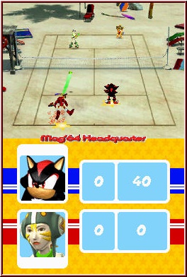 Ein weiterer großer Pluspunkt kommt nach der Charakterwahl. Die 10 enthaltenen Courts sind allesamt an Sega Spieleserien angelehnt und jede hat ihre besonders Note und Detailverliebtheit. Einen normalen Tennisplatz findet man hier als nicht vor. Finde ich gut und hebt die berühmtberüchtigte Corporate Identity. ;-) Wäre Sega auch schön Blöd wenn sie es nicht so gemacht hätten. Bevor es danach auf den Platz geht, könnte man die Anzahl der Spiele und den Schwierigkeitsgrad einstellen, sowie den Superstar Modus und damit die Specials aktivieren oder eben nicht. So eine Sache die Specials, die im Turnier Modus nun gerade nicht deaktivierbar sind. Aber dazu später mehr. Danach werden die Kontrahenten kurz vorgestellt und ab geht’s auf den gewählten Court. Per Kamerazoom wird zunächst der gesamte Platz gezeigt und dann langsam Herangezoomt. Etwas überraschend das man nicht beide Screens nutzt. Hätte ich eher erwartet und bietet sich eigentlich auch an auf dem DS. Im Endeffekt dient hier nur der Top Screen für die spielerische Action, während der Touch Screen einzig den Stand der Dinge in Sachen Punkten abdeckt. Die Übersicht ist auch auf einem Screen ausreichend, dennoch wäre die Doppelvariante sicher auch eine Überlegung wert gewesen. Spielerisch ist das ganze zunächst so angelegt das Ihr euren Charakter an der unteren Linie steuern werdet und in Sachen Regeln sich das ganze wie in der Realität spielt. Sei es die Punkte Vergabe, Vorteil oder Satz und Matchball. Hier muss man sich nicht umstellen. Erster Teil der Steuerung ist somit bei Aufschlagrecht der eröffnende Ball. In Sachen Steuerung und Tastenbelegung ist das System eigentlich recht simpel gestrickt und überfordert den Spieler keineswegs. Während Ihr den Charakter per Kreuz in eine Richtung dirigiert, die natürlich auch ans Netz führen kann, gibt es in Sachen Schlagvarianten die 4 wichtigsten im Tennis Sport. Per A-Taste habt Ihr den Top Spin zur Verfügung, per B-Taste den Slice. Dazu kommen mittels A+B der Lob und per B+A der Stoppball. Je nach Stand zum Ball und eben vor allem am Netz deckt die A-Taste auch den Schmetterball ab. Mehr ist es nicht und braucht es auch nicht.
