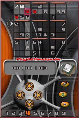 Was gleich zu Beginn auffällt, ist die Tatsache, dass es zwar durchaus möglich ist mit dem Touchpen im Spiel zu hantieren, allerdings darf man als Spieler die Felder des Knobelspaßes nicht direkt mit dem Stylus ausfüllen. Andere Vertreter bieten hier eine ausgefeilte Zahlenerkennungssoftware, diese fehlt in "Sudokumaniacs" leider komplett. So navigiert Ihr auf einem virtuellen Steuerkreuz durch eine Zahlrenreihe von eins bis neun, um die gewünschte Zahl auszuwählen. Alternativ reicht es aber auch eine Nummer direkt anzutippen, wobei das eigene Schreiben per Hand einfach mehr hergegeben hätte. Nichtsdestotrotz ist die Funktionsweise auch hier gegeben, demnach sollte man dem Umstand nicht allzu viel Bedeutung beimessen.
