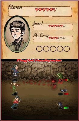 Dazu steht euch unterhalb im Touch Screen ein Menu zur Verfügung. Links findet man das Angriffssymbol für den Waffeneinsatz. Man tippt es an und wählt danach einen Gegner. Jetzt bewegt sich der Charakter zu diesem und würde seine Aktion auch ohne euer zutun ausführen. Bei Jared bedeutet dies er geht auf den Gegner zu, packt seine Keule aus und haut zu. Die TP werden euch angezeigt und dazu auch eine eingeblendete Lebensleiste des Gegners. Dazu gibt es aber nun einen Bonus. Bei jedem der 3 anders umgesetzt, kann man die TP erhöhen, wenn man kleine Touch Screen Spielchen löst. Bei Jared ist dies schnell einen Kreis zu zeichnen, bei Simon verschieden auftauchende Symbole in der richtigen Reihenfolge und ebenfalls nach Zeit anzutippen. Mallory bedient sich später gezeichneten Linien. Klingt eher unsinnig, ist aber ebenfalls gut eingebettet und bringt eben auch Bonus TP beim Gegner. Wäre nun der Gegner an der Reihe greift er euch ebenfalls direkt an. Hier habt Ihr ebenfalls in Sachen Timing die Möglichkeit zu Blocken und Angriffe abzuwehren. Dazu muss man im richtigen Moment den eigenen Charakter antippen, wenn der Gegner seinen Angriff startet. Soweit die physischen Angriffe, die sich von der Machart nicht großartig von anderen Rollenspielen unterscheiden. Zweite Variante sind die angesprochenen Kampfgeister. Über ein entsprechendes Symbol im Menu aktiviert man diese und tippt einen der verfügbaren im Inventory an. Gleichzeitig erscheint nun eine Leiste mit Punkten nach oben. Je höher nun eure Geistverbundenheit ist, umso stärker wird der Angriff. Einfach gesagt könnt Ihr anfangs bei Level 1 in diesem Bereich nur Stufe 1 der Geister nutzen. Allerdings immer noch effektiver als die normalen Waffen. Damit es nicht zu leicht ist, stehen diese wie schon erwähnt nicht unendlich zur Verfügung und auf der anderen Seite müssen auch hier die Touch Screen Spielchen getätigt werden. Lockern das Kampfgameplay auf und geben ihm einen eigenen Stil. Sind alle Gegner erledigt bekommt man EP und erhält eventuell die sogenannten Aufwertergeister.