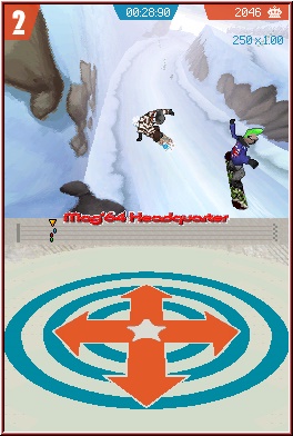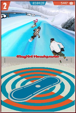 Bevor man nun ein Rennen angeht, oder später eben einen Challenge Run, wählt man wie schon angesprochen sein Board und ab geht die Luzie. Sehr schnell wird die große Besonderheit von Shaun White Snowboarding deutlich. Gesteuert wird einzig mit dem Touch Screen. Freunde der alten Kreuz/Tastensteuerung schauen hier in die Röhre. Erfordert zu Beginn auch ein wenig Eingewöhnungszeit, geht aber danach erstaunlich gut von der Hand. Hier spielt sich nun die eigentliche Action auf dem Top Screen ab, während ihr auf dem Touch Screen mittels Pen steuert. Einfach gesagt gibt man euch ein Fadenkreuz auf dem Top Screen, das identisch die Position eurer Handlungen auf dem Touch Screen wiedergibt. Bewegt Ihr also den Pen in die linke Bildschirmhälfte, lenkt euer Charakter auch nach links. Dazu greift hier das Prinzip, je höher im Screen ihr den Pen benutzt, um so schneller und weniger lenkbar ist er. Das Gegenteil, also langsam und gut lenkbar wenn ihr auf der unteren Hälfte agiert. Gefahren wird nun aus der typischen Third Person Perspektive gegen jeweils 3 Gegner. Hier hätte man sich schon ein paar gewünscht. Um die Rennen zu Gewinnen, ist mehr nötig, als nur die Strecke nach unten zu brettern. Gerade zu Beginn, ohne die Bonusaufkleber für die Boardslots ist man einen Tick langsamer als die Gegner. Beschleuniger oder Nitros in der Art gibt es nicht, also muss hier neben einigen Abkürzungen hier und da, die Trick Action herhalten um zu Beschleunigen. Auch dieses System ist recht durchdacht und macht auch nur zu Beginn ein wenig Probleme. Anfangs schimpft man noch drüber. Später eigentlich nicht mehr. Fährt man z.b. auf eine Schanze zu, bewegt man kurz vor der Kante den Pen nach unten und an der Kante in einer Wischbewegung nach oben. Dann springt der Charakter hoch in die Luft. Dort könnt Ihr nun erstaunlich viele Moves machen, auch wenn einige wenige ausreichen um zurecht zu kommen. Hier kommen dann doch mal Kreuz und Tasten zum Einsatz. Damit löst man zunächst den Trick selber aus. Drehungen, die ebenfalls elementar sind, werden aber auch hier mit dem Pen über den Touch Screen gelöst. Kurz vor der Landung sollte man den Touch Screen "Loslassen" um sicher zu Landen. Hat man das geschafft gibt’s Jubler der Zuschauer und Ihr bekommt einen kurzen Temposchub. Also sollte man dieses Prozedere überall versuchen, wo man abheben kann.