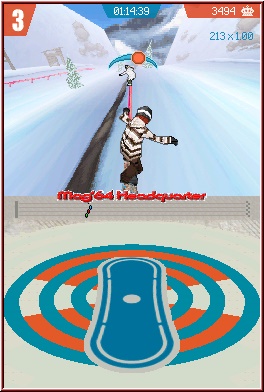 Im Gegensatz zu den Charakteren, ist hier die Wahl um einiges wichtiger. Nicht nur deshalb weil sich die Boards in den Stats Speed, Balance und Trick unterscheiden, sondern weil man diese mit der Zeit noch upgraden kann. Dafür existieren 3 Slots pro Board. Im Spiel kann man 42 sogenannte Aufkleber erspielen. Jeder Aufkleber verbessert in verschiedenen Stufen das Board. Mit der Zeit hat man dann aber die Qual der Wahl, wie man seine viel zu vielen Aufkleber auf die viel zu wenigen Slots verteilt. ;-) Allerdings und das ist sicherlich recht durchdacht, könnt Ihr vor jeder Aufgabe im Spiel, diese auch neu Verteilen. Steht also ein Rennen an, so packt man einfach 3 „Speedbooster" in die Board Slots. Steht ein Trick Event an, nimmt man halt diese dafür. Eine gute Idee und ansprechend umgesetzt, da es sich auch auswirkt. Ganz speziell spürbar bei allen Rennevents. Grundlage des Spiels was die Ziele angeht sind sogenannte Tickets, die im Spiel alle Events nach und nach Freischalten. Zu Beginn geht es nur in Park City zur Sache, wo man auch die auf dem DS ungewöhnlicher Steuerung für ein Spiel dieses Genre erleben und erlernen kann. Ich überspringe mal das Tutorial und erkläre euch die Feinheiten gleich unter Wettkampfbedingungen. Ausgangspunkt ist der Location Bildschirm. Auf diesem bekommt ihr im Top Screen neben der Weltkarte, der Anzahl der erspielten und für die nächsten Aufgaben nötigen Tickets. Der Touch Screen dient nun um die möglichen Orte zu wechseln und in diesen jeweils 2 Event Varianten anzugehen. Eingeteilt ist jeder Ort in reine Rennen und die sogenannten Challenge Runs. Klingt nach wenig, zeigt aber schnell das mehr drin steckt. Die 4 Hauptorte im Spiel sind in Bergregionen eingeteilt und bieten dort jeweils 3 Strecken bis zum Ziel. Sind im Rennen Modus die Strecken vorgegeben, so könnt Ihr im Challenge Run die Strecke frei wählen, um die vielen geforderten Aufgaben zu lösen. Kümmern wir uns erstmal um die Rennen selber. 4 Rennen gilt es immer zu absolvieren, die man nur als Erster auch als gelöst gewertet bekommt. Hier greift also der typische Sportlerspruch „Der Zweite ist der erste Verlierer". ;-) Für jedes Rennen ist eben eine bestimmte Anzahl der Tickets möglich. Im Verlauf führt das dazu, das Ihr ständig zwischen Rennen und Challenge Run hin und herwechselt, um auf die immer wieder geforderten Mengen zu kommen.