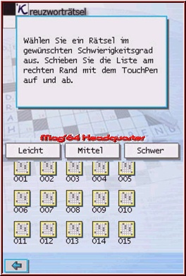 Den Inhalt von "Kreuzworträtsel" widerzugeben, ist im Grunde nicht sonderlich schwer, die Spieltiefe ergibt sich aus den Anforderungen, die der Titel an den Spieler stellt. Drei unterschiedliche Schwierigkeitsgrade säumen den Weg zum ultimativen "Kreuzworträtsel"-Checker, wobei die Verteilung der dort anwählbaren Rätsel überall ähnlich ist. 555 Aufgaben warten im Gesamten auf den Spieler, wobei Ihr - um alle zu lösen - Wochen benötigen werdet. Leichtere Rätsel sind zum einen überschaubarer und einfacher in der Auswahl der Fragen, anspruchsvollere hingegen wahre Zeitfresser, die das Gehirn zum Kochen bringen, da neben dem eigentlichen Wissen, auch ein Quäntchen Kombinationsgabe vonnöten ist. Zu Beginn können sich Freunde des "Kopfsports" entweder an ein "Zufälliges Rätsel" heranwagen, oder im Modus "Rätsel auswählen" direkt innerhalb der drei Schwierigkeitsgrade herumstöbern. Dank eines Schiebereglers scrollt Ihr durch die ewigen Rätsellisten - bereits gelöste Aufgaben sind durch ein grünes Häkchen markiert und daher ist sofort ersichtlich, ob Ihr Euch an jene Denksportaufgabe bereits herangewagt habt.