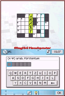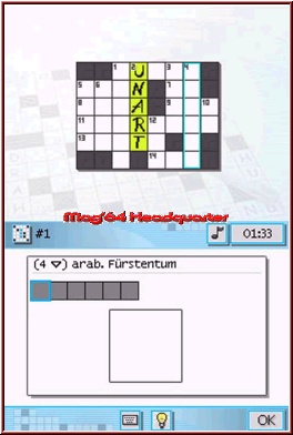 Gelöst ist die Umsetzung insofern genial, als dass das eigentliche Kreuzworträtsel am Topscreen des Nintendo DS erscheint. Einzelne Kästchen beinhalten Zahlen, die wiederum signalisieren, dass von diesem Feld aus eine Lösung niedergeschrieben werden muss, wobei zu besagter Zahl wiederum eine Fragestellung gehört, die am Touchscreen in Listenform zu finden ist. Da Eure Lösungen entweder waagerecht oder senkrecht notiert werden müssen, wird dieser Umstand auch in der Frageliste durch kleine Pfeile kenntlich gemacht, die anzeigen, ob die Lösung nun von links nach rechts oder von oben nach unten vermerkt wird. In einer Klammer findet Ihr zur Verdeutlichung neben einer Platzhalterliste nochmals die Anzahl der Buchstaben des Lösungswortes. Habt Ihr bestimmte Begriffe bereits gelöst, erscheinen einzelne Buchstaben innerhalb der Platzhalter. Dadurch wird Euch das Lösen des Rätsels vereinfacht, denn bestimmte Begrifflichkeiten ergeben sich nach kurzer Zeit von ganz alleine. Ob nach gewissen internationalen Kennzeichen gesucht wird, nach Schöpfungen bedeutender Dichter und Denker oder nach einem anderen Wort für "Zeitungslüge" (Lösung: "Ente"), ist abhängig vom Kreuzworträtsel und dem zugrunde gelegten Schwierigkeitsgrad. Habt Ihr Euch aus der Fragenliste für eine entschieden, tippt Ihr diese an und dürft nun entscheiden, ob Ihr die Lösung per Schrifterkennung oder per Tastatur eingebt. Erstere funktioniert ähnlich gut wie bei Nintendos Gehirn-Trainern.
