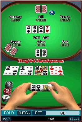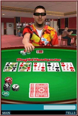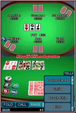 Entgegen der Konkurrenz spielt man hier mit 6 Teilnehmern was nochmals eine kleine Aufwertung bedeutet. Jeder der 6 Spieler beginnt mit dem gleichen Geldbetrag und erhält zu Beginn 2 Karten die nur er sieht. Dazu liegen nun nach und nach 5 Karten auf dem Tisch, die aufgedeckt werden. Das nach und nach sind dabei auch die Spielrunden in denen die Spieler entscheiden ob sie Aussteigen, Mitgehen oder erhöhen. Spätestens wenn alle Karten auf dem Tisch aufgedeckt sind gibt es den Showdown und alle müssen die Hosen runterlassen. Danach greifen die üblichen Regeln mit Paaren, Drillingen, Straßen oder Full House. Was mir hier so gut gefällt ist ebenfalls die einfache und intuitive Bedienung über den Touch Screen und neben dem eigentlichen Spannungseffekt die KI der Gegner, die zu gerne auch mal Blöffen. Auch einen Reiz hat das ganze durch die Ermittlung eines wirklichen Siegers. Ist der feste Geldbetrag eines Spielers mal auf Null gefallen verläßt er den Tisch. Und das solltet nicht Ihr sein. ;-) Am Ende spielen 2 Spieler das gesamte Geld unter sich aus und es gibt nur wirklich einen Sieger. Dabei hat jede Runde seinen Reiz und die Spielchen gehen durchaus mal 30 Minuten und mehr. Dabei geht man hier nun einen weit ausladenderen Weg der Präsentation als z.b. bei der schlankeren Variante in Sega Casino. Zum einen wird jeder Mitspieler mittels eines eigenen Avatars dargestellt und jede Runde der Gegner auch einzeln visuell im Top Screen dargestellt. Dabei kommen hier nun die sogenannten Tells zu ihrem Recht. Kleine Aktionen die dem Gegner einen Blöff oder Nervosität suggerieren sollen. Man selber hat diese Möglichkeiten auch, die vom Arme verschränken, Blinzeln oder am Kopf kratzen reichen. Macht man eine Aktion z.b. immer wieder merken sich das die Gegner und steigen z.b. öfters mal aus wenn Ihr bei diesen Aktionen hinterher gewonnen hattet. Ein durchaus lustiges Feature das man erst mit der Zeit näher kennen und schätzen lernt. Anfangs findet man das ganze eher etwas lächerlich. Das gleiche gilt auch für die Gegner.