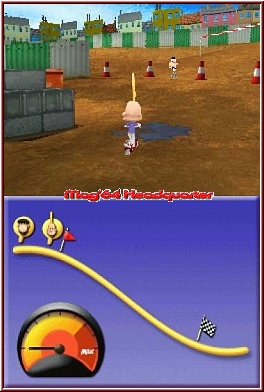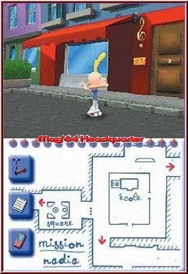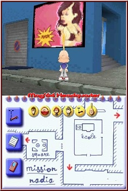 Nach einer kleinen Einführung läßt man euch dabei schnell die Steuerung übernehmen. Dabei ist das Spiel in 2 Gameplay Teile eingeteilt. Einen Art Adventure Modus und die eigentlichen Minispiele. Der Adventure Modus erinnert an 3D Spiele und Ihr schaut hier im Top Screen in einer Third Person Sicht auf das Geschehen. Hier spielt der Touch Screen mehr informatorisch eine Rolle und bietet eine Karte der Umgebungen. Innerhalb der Umgebungen, die mit der Zeit immer mehr werden trifft Titeuf diverse Charaktere, die entweder Tipps oder eben Aufgaben in Form der Minispiele in petto haben. Im Adventure Teil ist die Steuerung dann auch recht simpel und wird auch über die Actiontasten gelöst. Per Kreuz bewegt Ihr Titeuf duch die Gegend und könnt mit der A-Taste Personen ansprechen. Dazu kommt mit der L und R Taste die Möglichkeit dazu die Kamera frei um Titeuf zu drehen. Zoomen oder den Blickwinkel verstellen kann man nicht, ist aber aufgrund der friedlichen Umgebung nicht nötig. Mit Gefahren, die vielleicht eine Lebensleiste erforderlich machen würden habt Ihr hier nichts am Hut. Der Adventure Modus ist wirklich nur Mittel zum Zweck und die Minispiele sind der Kern des Spiels. Neben der Karte bietet in diesem Modus der Touch Screen auch die Möglichkeit eine Art Datenbank aufzurufen, in der man alle Minispiele mit Namen aufgelistet zu sehen bekommt. Solche die gelöst sind werden dabei durchgestrichen dargestellt. Übrigens hat man auch so das Speichern gelöst. Habt Ihr ein Minispiel gelöst streicht Ihr mit dem Pen über den Touch Screen den Minispiel Eintrag durch und das Spiel sichert so euren Fortschritt. Der Ablauf um im Spiel voran zu kommen ist nun fast immer gleich. Auf der Karte findet Ihr meist kleine Hinweise wie Pfeile oder Charakterköpfe wohin euch die Reise aktuell führt. Man läuft also durch die Gegend und sucht nach dem auf der Karte abgebildeten Charakterkopf. Man spricht ihn an und landet meist in einem der Minispiele.