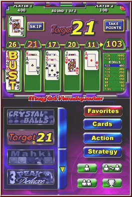 Bei diesem Kartenspiele seht Ihr fünf Spalten vor Euch, die mit Karten gefüllt werden wollen. Drei Runden dauert ein komplettes Spiel, wobei es das Ziel ist, jede Spalte mit Karten des Maximalwerts von 21 (Ass: ein Punkt oder 11 Punkte wert!) zu füllen. Das bestmögliche Ergebnis sind summa summarum also 105 Zähler - auch der ausgespielte Bonus ist bei diesem Wert am höchsten. Ihr solltet also eine Portion Glück mitbringen, aber auch der taktische Einsatz der Kartenaufteilung ist hier der Weg zum Ziel.