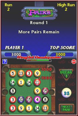 Bei "Pairs" befindet Ihr Euch auf einem Billardtisch und müsst die dort befindlichen, nebeneinander liegenden Kugeln, welche die gleiche Zahl aufweisen, auflösen. Mit der weißen Kugel lassen sich taufrische Kugeln auf das Spielfeld bringen, ebenso könnt Ihr zweimal während eines Spieles die Kugelanordnung mischen.