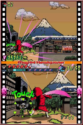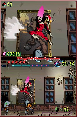 Was Capcom bei "Viewtiful Joe - Double Trouble!" für den Nintendo DS geschaffen hat, ist einmalig! Allein die Tatsache, dass der Touchscreen genial im Gameplay verwoben wurde, zeugt von der technischen Raffinesse mit welcher die Entwickler an ihr Werk gegangen sind. Das Spielgeschehen findet zum Großteil auf dem unteren der beiden DS-Bildschirme statt, wobei wichtige Ereignisszenen auf dem Topscreen dargestellt werden. Beispielsweise gibt Euch der obere Bildschirm Hinweise, so dass die Lösung eines Rätsels dann auf dem Touchscreen vorangetrieben werden kann. Jedes der insgesamt sechs großen Kapitel teilt sich in eine Vielzahl an kleinen Abschnitten auf, die neben angriffslustigen Gegnern vor allem herausfordernde Rätsel beinhalten. Obwohl die Kost auf dem DS machbar erscheint, trifft man dennoch während des Spielverlaufs auf einige Brocken. Um einen Abschnitt hinter sich zu bringen, gilt es zumeist eine bestimmte Gegneranzahl dingfest zu machen, eine Fahne zu erreichen oder die Rätsel im Spiel zu meistern.