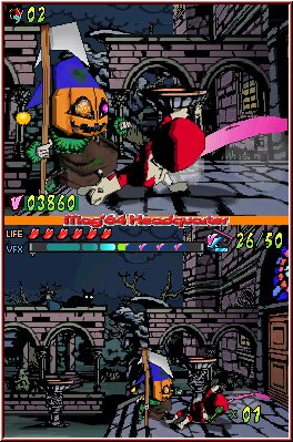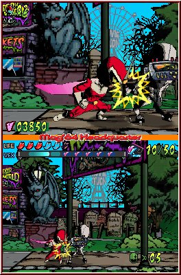 Viewtiful Joe ist bekanntlich kein typischer Superheld, vielmehr ist er ein Garant spezieller Action, die andere Helden zwar gerne bieten würden, jedoch nicht in der Lage sind diese umzusetzen. Neben gewöhnlichen Attacken wie dem Schlag oder einem Tritt beherrscht Joe so genannte VFX-Action-Kräfte, die Eure Gegenüber in den meisten Fällen zu lächerlichen Witzfiguren verkommen lassen. "VFX-Zeitlupe" verlangsamt das Spielgeschehen beträchtlich und erhöht die Intensität Eurer Attacken außerordentlich. Nutzt Ihr beispielsweise eine Art Trampolin, ist das Resultat in Kombination mit "VFX-Zeitlupe" äußerst viel versprechend. Joe erreicht damit ungeahnte Höhen und kann demnach selbst riesige Hindernisse problemlos überqueren. Mit "VFX-Kratz" nutzt Ihr dann zum ersten Mal den Touchscreen Eures Nintendo DS. Habt Ihr die VFX-Kraft mit der "R"-Taste aktiviert, darf der Bildschirm nun mit dem Touchpen nach Lust und Laune bearbeitet werden. Nahende Gegner werden dann von herabfallenden Objekten ausgeknockt. Je doller Ihr über den berührungsempfindlichen Bildschirm streicht, desto heftiger ist das Ergebnis! Oftmals müssen VFK-Kräfte auch untereinander kombiniert werden, um ein Ziel zu erreichen und im Level fortfahren zu können. Mit "VFX-Teilen" könnt Ihr den unteren Bildschirm teilen und löst dadurch bestimmte Ereignisse aus.
