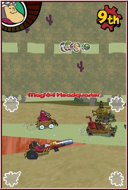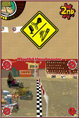 Mithilfe des Turbo-, Angriffs-, Flug- sowie des Bonus-Pickups solltet Ihr den Vorteil auf Eurer Seite haben. Zwar wurde der Einsatz der auf den Strecken herumliegenden Gegenstände individuell für jeden Fahrer dargestellt, einzigartige Items, die speziell für einen bestimmten Lenker konzipiert wären, existieren hingegen nicht. Auf Knopfdruck aktiviert Ihr die maximal zwei möglichen Pick-Ups und könnt im Folgenden über das Fahrerfeld hinweg fliegen, ein paar Bömbchen nach unten werfen und an den Konkurrenten mühelos vorbeiziehen. Was neu ist am Spielkonzept, sind die ab und an auf der Strecke gesetzten Linien, die anzeigen, das nun – während des Rennens – ein Minispiel folgt. Von böswilligen Halunken (Fliegbert von Sichthofen!) belauert, gilt es dann, Muttern am Reifen festzuzurren, eine Luftpumpe korrekt an ein Ventil anzusetzen, von oben herabfallenden Bomben auszuweichen, Gaswolken mit dem Stylus zu „zerschneiden" oder hochexplosiven Sprengstoff von der Piste zu kicken. Misslingen Euch die wenige Sekunden andauernden Situationen, verliert Ihr ein wenig an Vorsprung, anderenfalls geht es ohne Zwischenfälle im Renngeschehen weiter. Gefällt uns! Wird Eure Karosse kurzfristig aus dem Verkehr gezogen respektive zerstört, liegt es an Euch, vier Fahrzeugteile in Windeseile nach Bauanleitung zusammenzustellen. Erst dann könnt Ihr Die Fahrt ungehindert fortsetzen und den Zielspurt aufnehmen, der durch kräftiges Bildschirm-Massieren und durch eine gesunde Puste-Lunge erfolgt. Den einen oder anderen Tabellenplatz kann ein Wacky Racer auf diese Weise durchaus noch zurückgewinnen: Ob freilich noch zehn Punkte drin sind, ist indes fraglich.