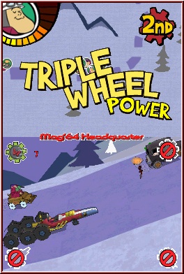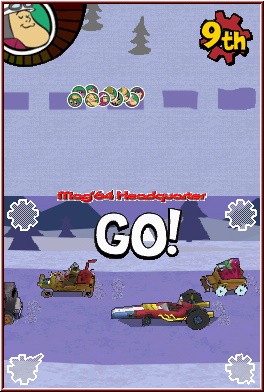 Und weil es sich für ein Umsetzung eines an den großen Klassiker angelehnten Spielkonzeptes so gehört, spendierte man jedem Fahrer gleich auch vier Spezialfertigkeiten, die auf den Strecken verteilt herumliegen und aufgesammelt werden, indem Ihr über sie hinweg fahrt. Innovativ gestaltet ist die Steuerung von „Wacky Races – Crash & Dash". Denn anders als gewöhnlich, bedient Ihr Euren Boliden nicht mit dem Steuerkreuz, sondern allein mit dem Stylus, mit welchem Ihr die Richtung vorgebt. Auf die Geschwindigkeit müsst Ihr indessen nicht achten, denn diese reguliert sich selbstständig. Gebremst wird, indem Ihr den Touchpen wieder vom Screen nehmt. Lediglich die „Klingel-Ling-Rallye" ist zu Beginn anwählbar, erst nachdem die erwartete Punktzahl erreicht wurde, öffnet sich das nächste Portal. Aus je drei Rennen sich zusammensetzend, geht es gar nicht so verrückt her, wie der Titel des Hauptmodus‘ erwarten ließe. Obwohl eine Minimap existiert, ist der Überblick der ausgewählten Strecke nie befriedigend, denn weil das Geschehen von schräg oben dargestellt wird, verpasst Ihr Hindernisse wie Steinbrocken, Bäume oder Sackgassen gerne das eine oder andere Mal. Nichtsdestotrotz stellt sich ein faszinierendes Spielgefühl ein: Ihr wollt alles sehen, jede Strecke testen und selbstverständlich auch den bislang versperrten Schwierigkeitsgrad zugänglich machen. Das kann ja heiter werden, denn die Pisten sind teilweise verwegen und nur von furchtlosen „Pistenschweinen" fehlerlos zu meistern.