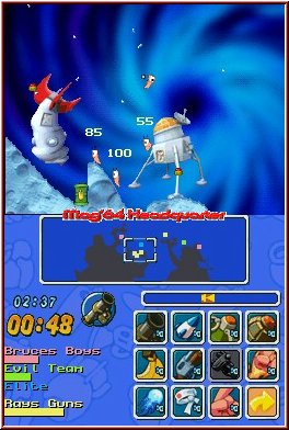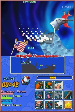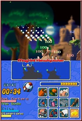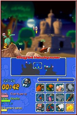 Das Spielprinzip ist dabei relativ leicht zu begreifen. Im Grunde genommen hat jeder Wurm eine gewisse Anzahl an Energiepunkten, die durch den Einsatz von Waffen in bestimmtem Maße zur Neige geht. Erreicht die Anzeige den Nullpunkt, bedeutet dass das Aus für Euren Recken. Mit dem Touchpen bewegt Ihr die Kamera und zentriert das Geschehen ganz nach Wunsch. Euer Team besteht aus vier eigenständigen Würmern, die im Wechsel mit den verfeindeten Teilnehmern zum Zug kommen. Der Einsatz der zur Verfügung stehenden Waffen erfolgt über das berührungsempfindliche Display. 22 Aktionsmöglichkeiten habt Ihr während einer Wurmrunde. Den aktuell zu kontrollierenden, haarlosen Schlachtenteilnehmer dirigiert Ihr leichthändig durch die Landschaft, ein Druck auf die "A"-Taste hat einen Sprung zur Folge. Rückwartssalti, um höhere Ebenen zu erklimmen, sind ebenso im wurm'schen Bewegungsrepertoire vertreten. Die Windanzeige ermittelt die aktuelle Windrichtung sowie -stärke. Abhängig davon wird Euer Waffenarsenal beeinflusst, welches sich aus den verschiedensten Schießprügeln, Bomben sowie weiteren durchschlagenden Goodies zusammensetzt.